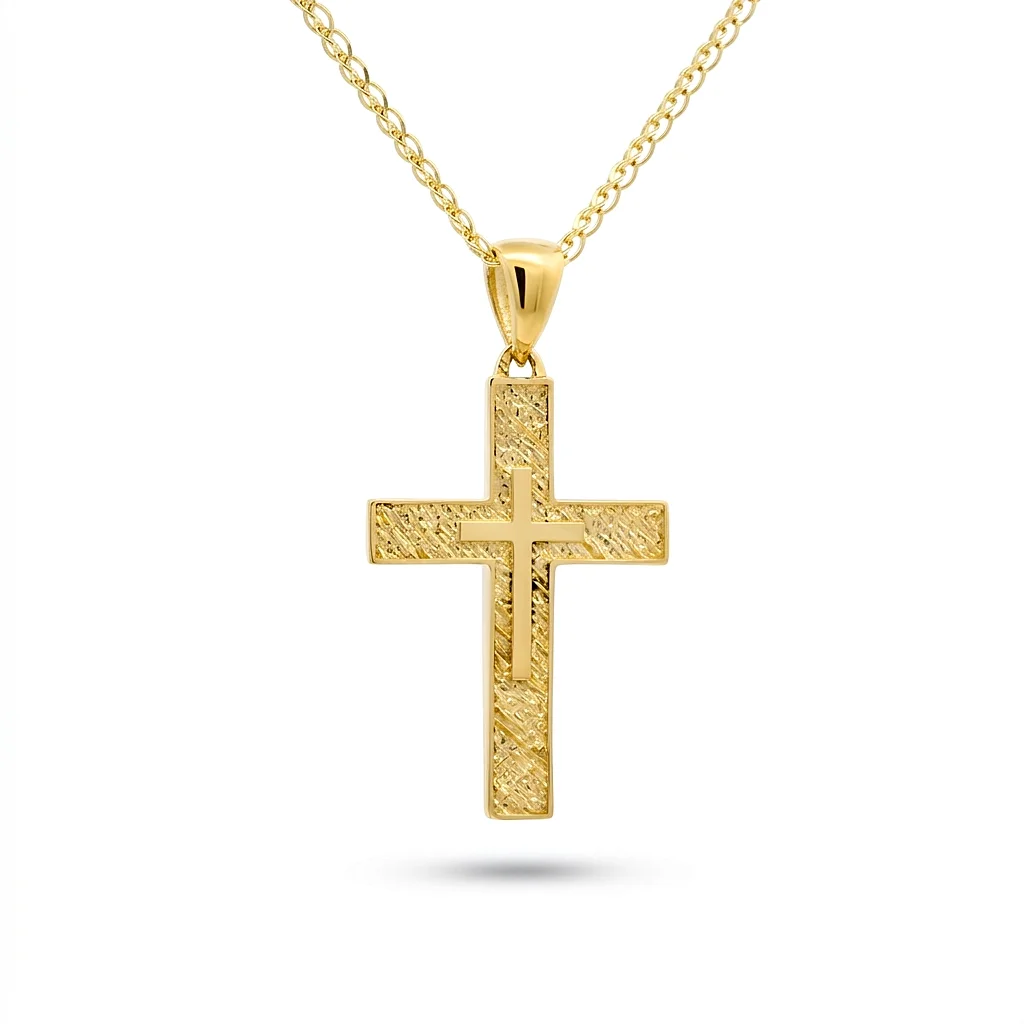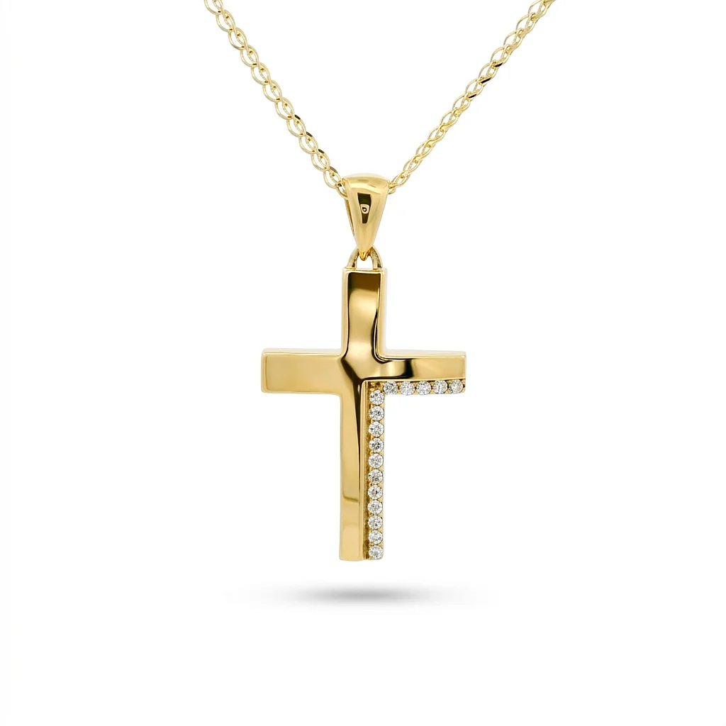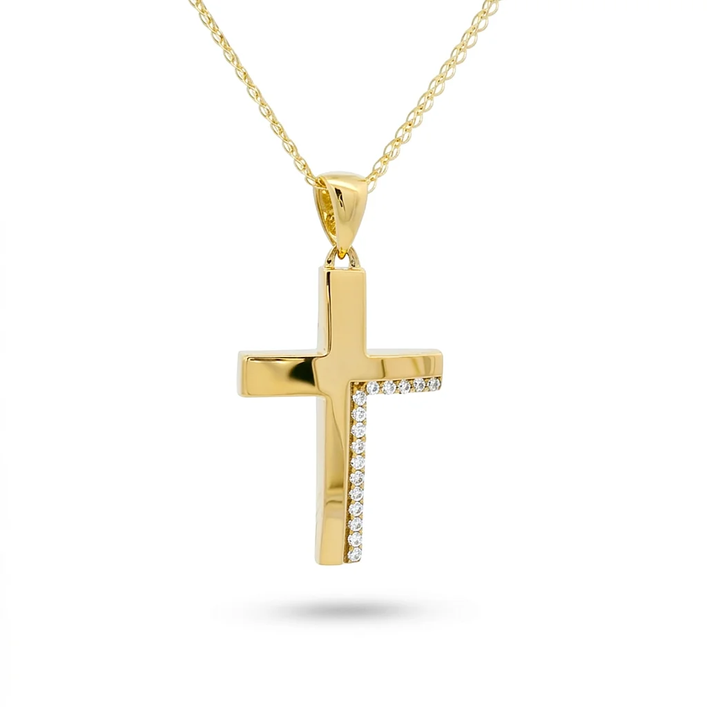 Σταυρός γυναικείος διπλής όψης σε κίτρινο χρυσο 14 καράτια με πέτρες ζιργκόν. The chain is sold separately.