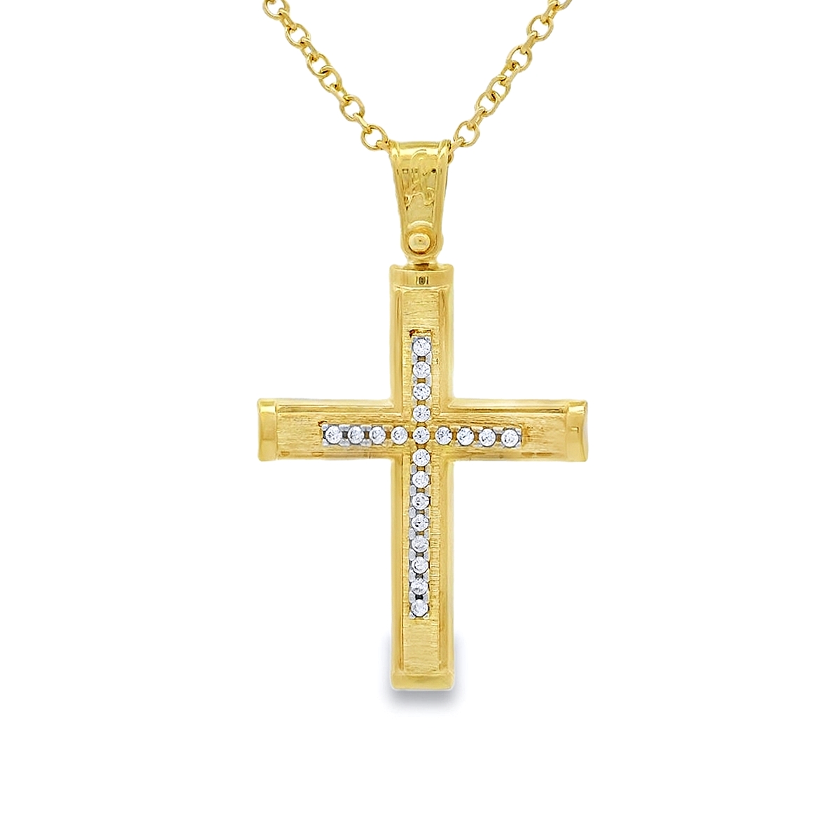 Women's cross in yellow gold 14 carat with cubic zirconia stones. The chain is sold separately.