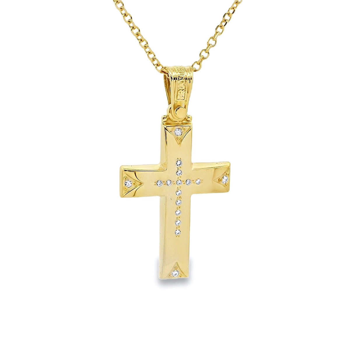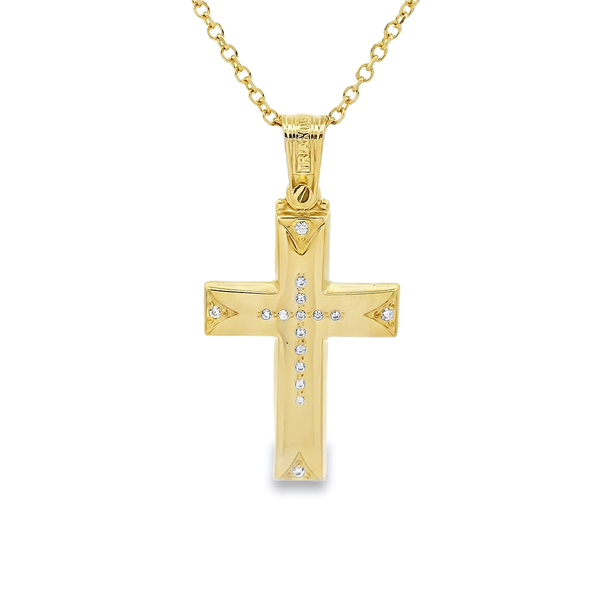 Women's cross in yellow gold 14 carat with cubic zirconia stones. The chain is sold separately.