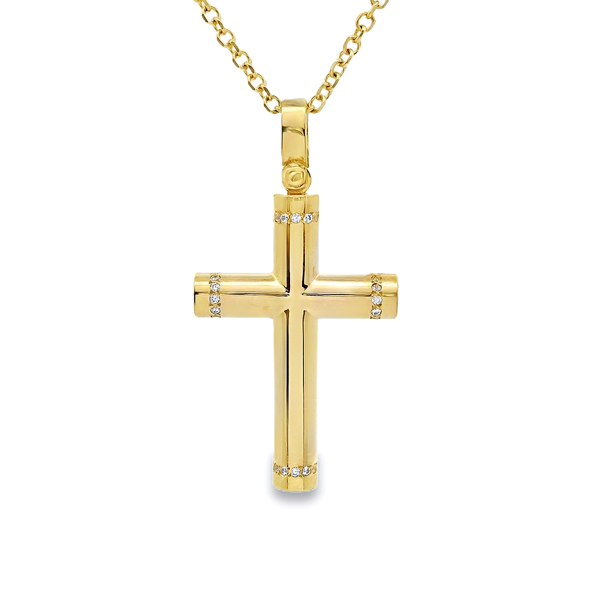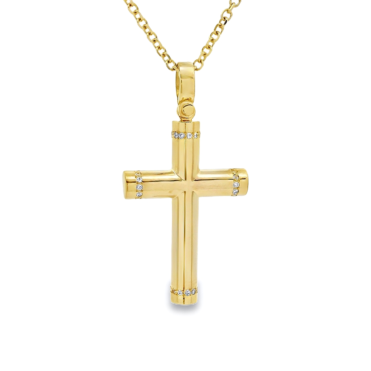 Women's cross in yellow gold 14 carat with cubic zirconia stones. The chain is sold separately.