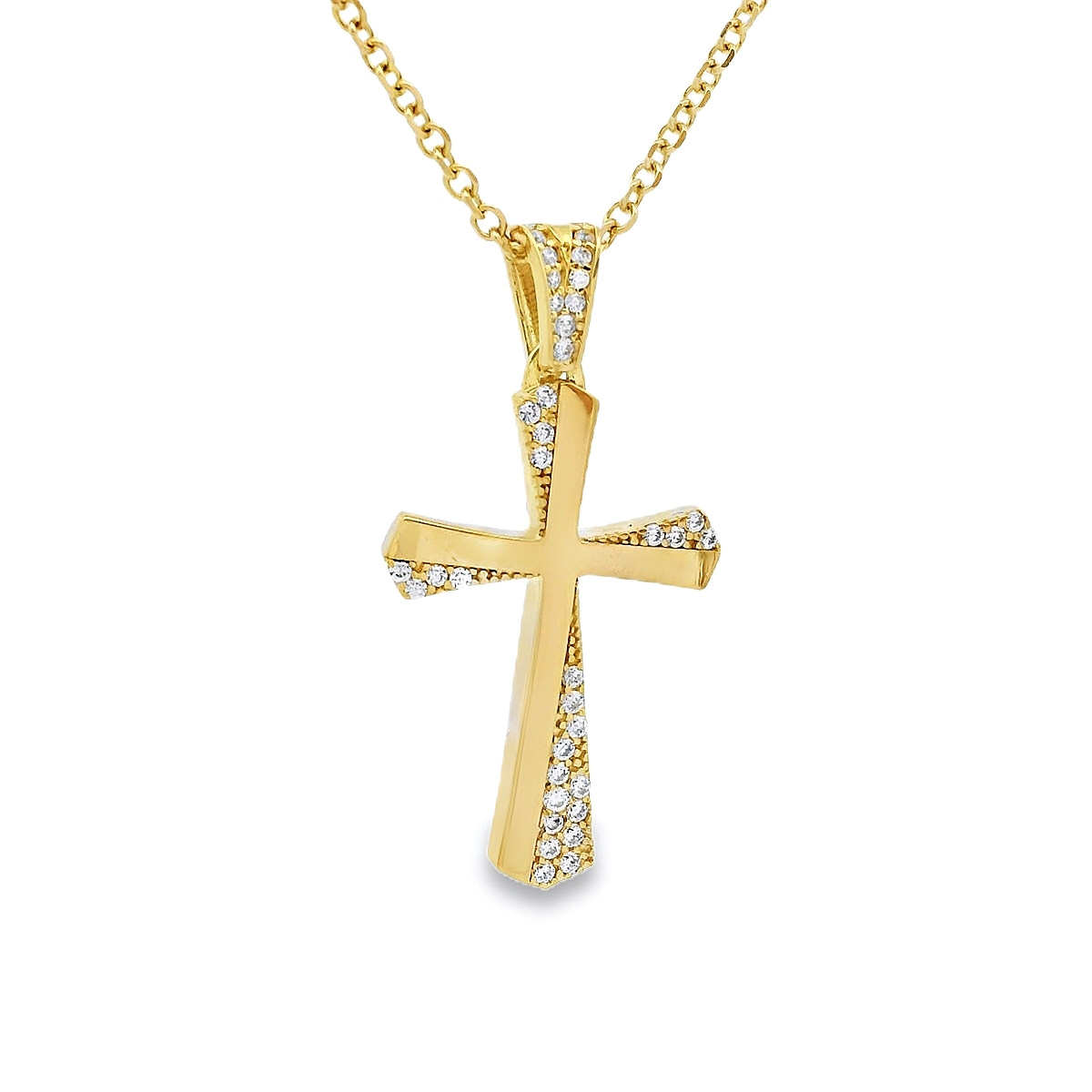 Women's cross in yellow gold 14 carat with cubic zirconia stones. The chain is sold separately.