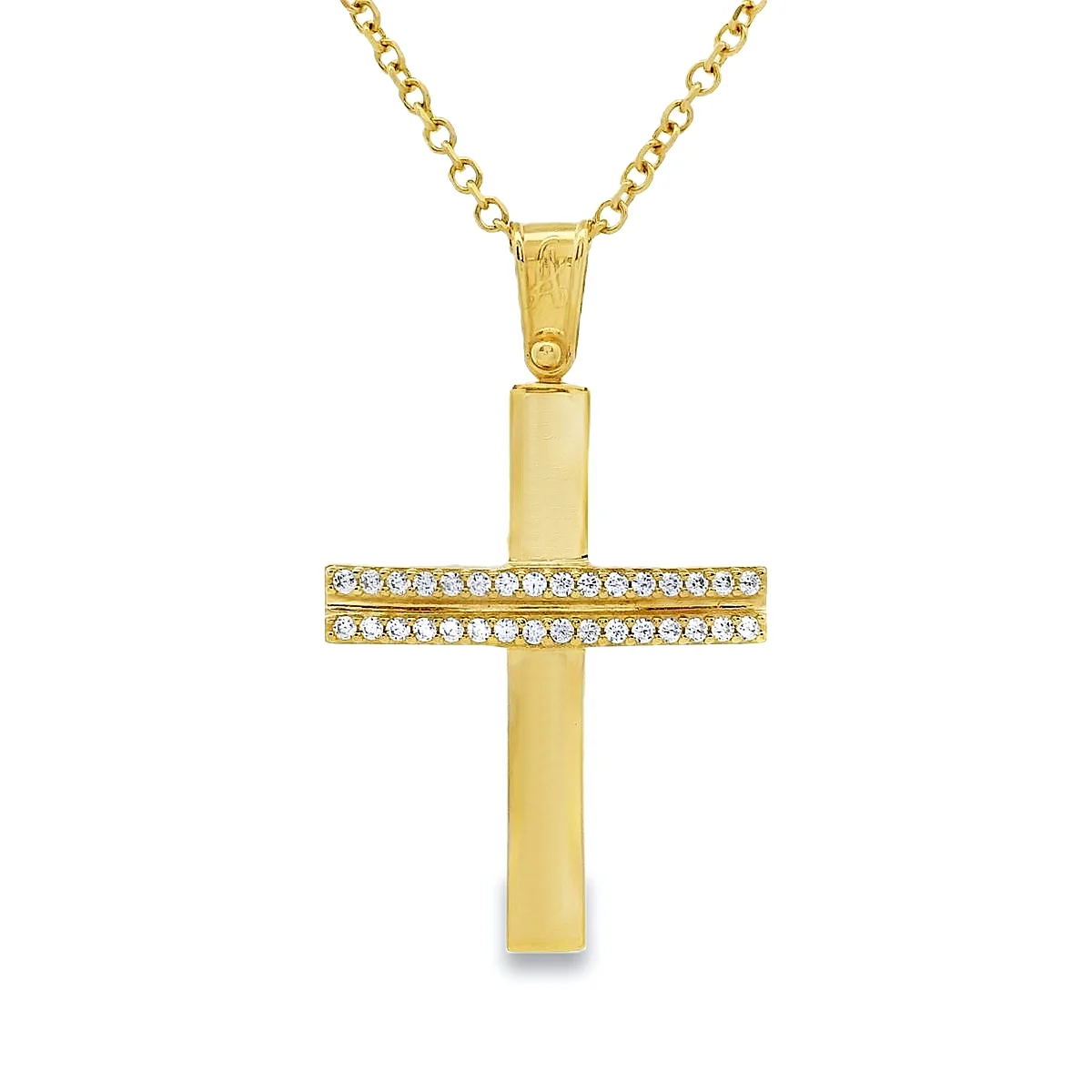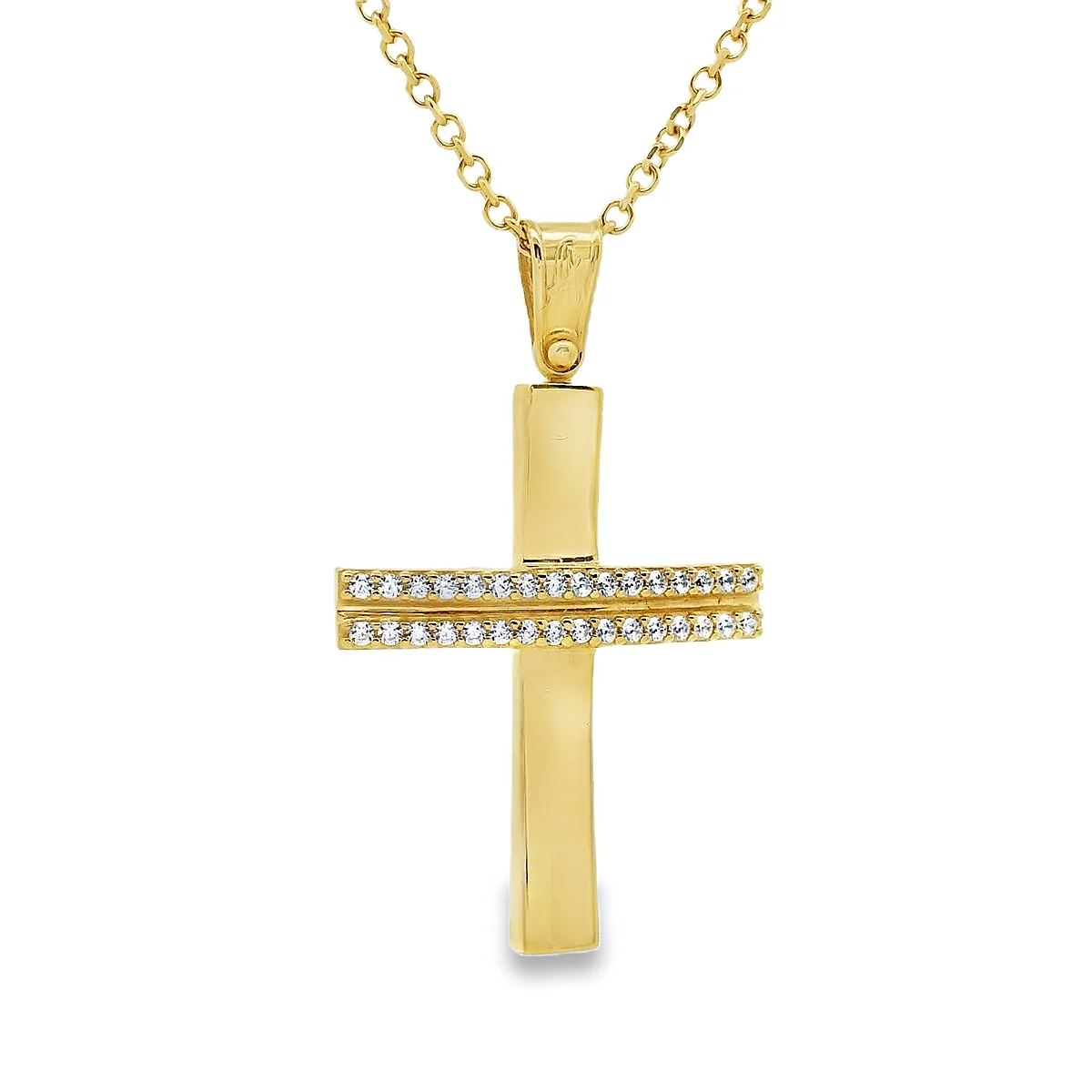 Women's cross in yellow gold 14 carat with cubic zirconia stones. The chain is sold separately.