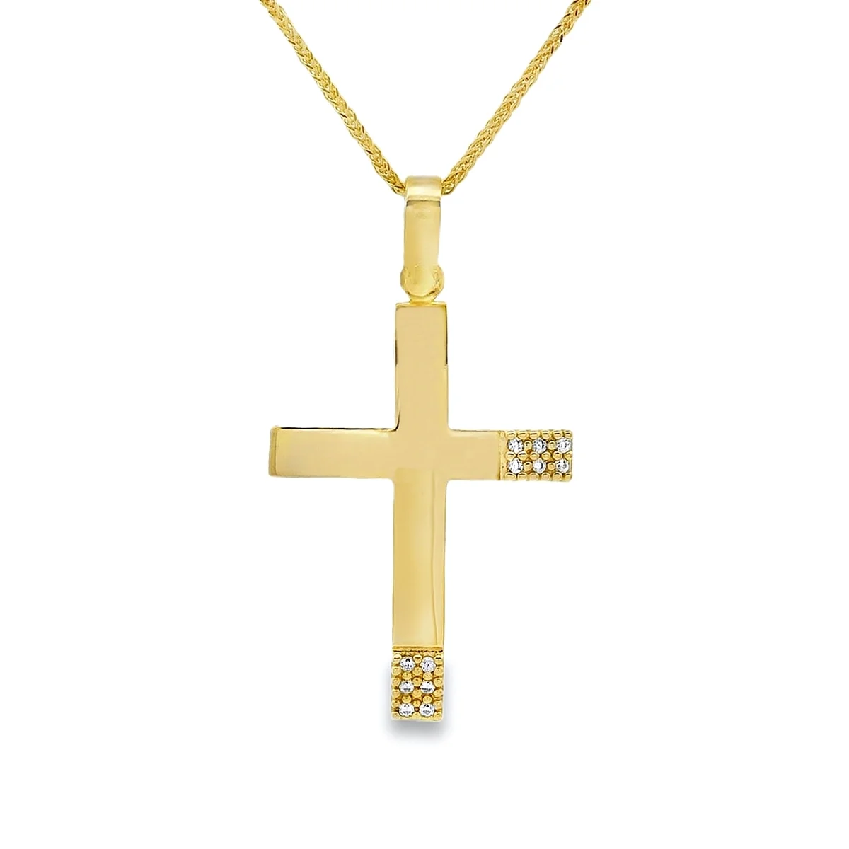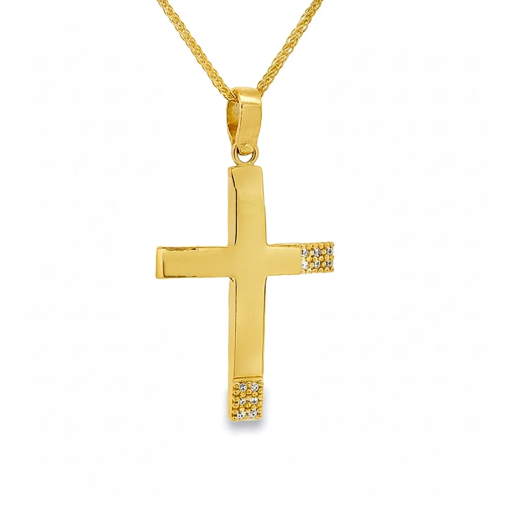 Women's cross in yellow gold 14 carat with cubic zirconia stones. The chain is sold separately.