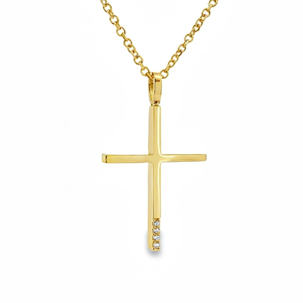 This cross is the epitome of modern, minimalist jewelry. Ο clear, shiny Yellow Gold is discreetly interrupted by a series of three shiny zircons on the bottom edge. It is a sophisticated way to wear the symbol of your faith, adding a touch of sophistication to the discreet, but noticeable shine.