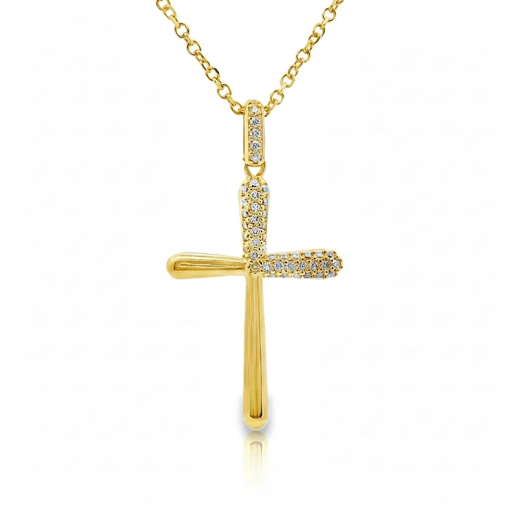 An μοντέρνο and εκλεπτυσμένο κόσμημα που συνδυάζει την κλασική θρησκευτική σημασία με τη σύγχρονη αισθητική. Αυτός ο χρυσός σταυρός ξεχωρίζει χάρη στη διακριτική αλλά έντονη λάμψη του. Ο σταυρός έχει ένα γραμμικό, μινιμαλιστικό σχήμα. Το κάτω κάθετο σκέλος διατηρεί ένα λείο, γυαλιστερό φινίρισμα χρυσού, ενώ το πάνω μισό του κάθετου και το οριζόντιο σκέλος είναι στολισμένα με sparkling zircons. Είναι η τέλεια επιλογή για όσους αναζητούν έναν σταυρό που να φοριέται daily αλλά να μπορεί επίσης να αναδείξει μια βραδινή εμφάνιση. Αποτελεί ένα εξαιρετικό δώρο για βαπτίσεις, γενέθλια ή ως σύμβολο αγάπης και προστασίας.