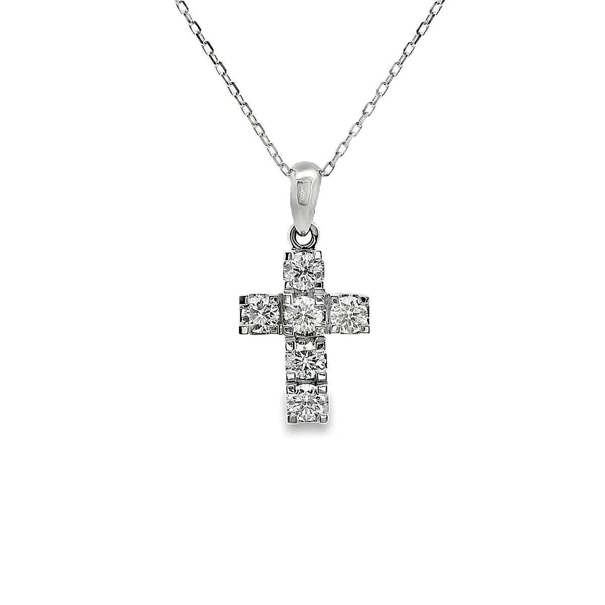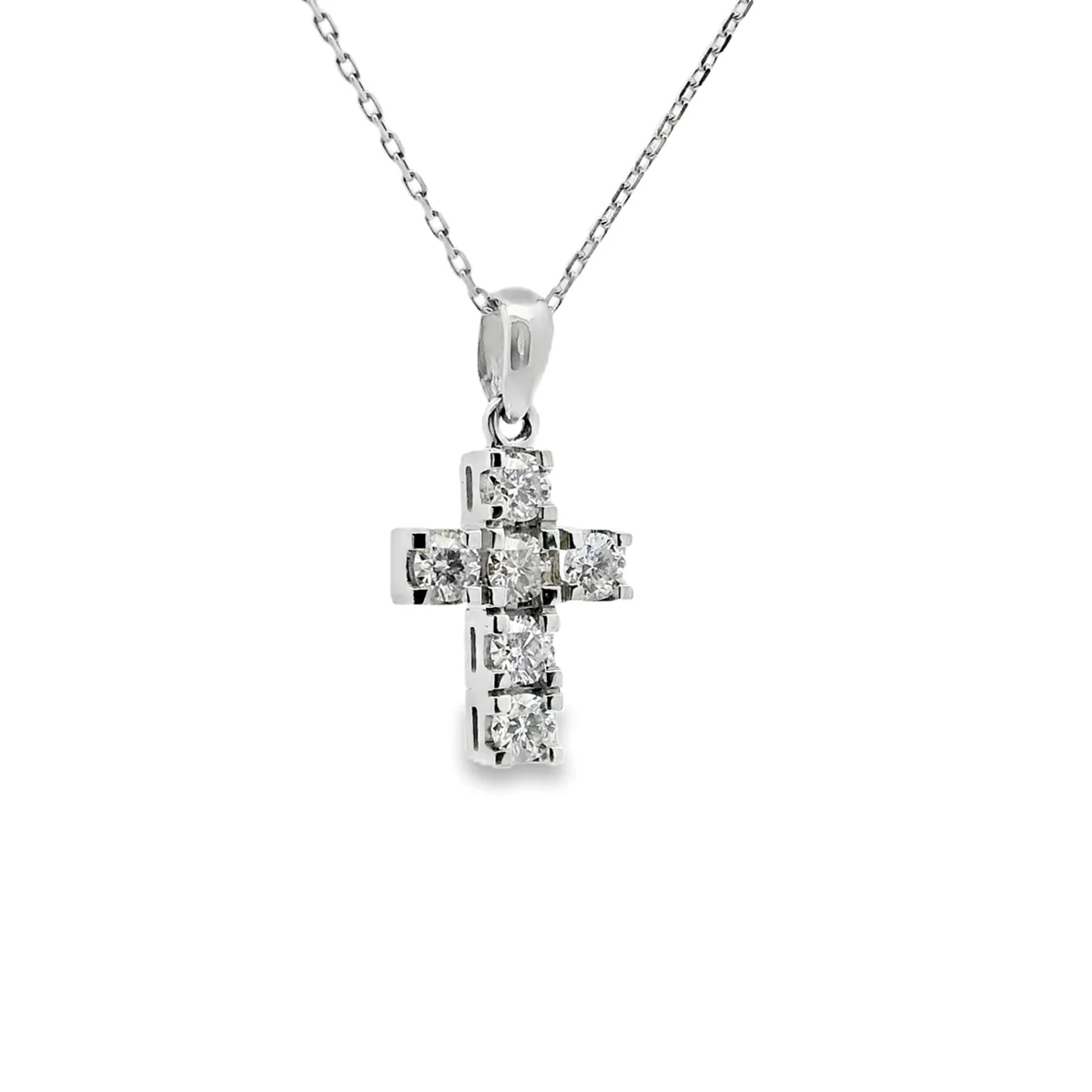 Γυναικείος σταυρός σε λευκόχρυσo 18 καράτια με λευκά διαμάντια σε κοπή μπριγιάν συνολικού βάρους 0,49ct, χρώματος G και καθαρότητας VS. Μήκος αλυσίδας 40cm.