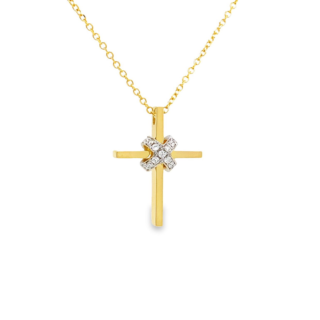 Women's cross, handmade, bicolour, in yellow and white gold 18 carats with brilliant-cut diamonds, total weight 0,10ct, colour F and clarity VS1.