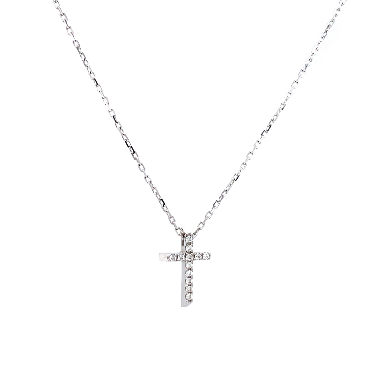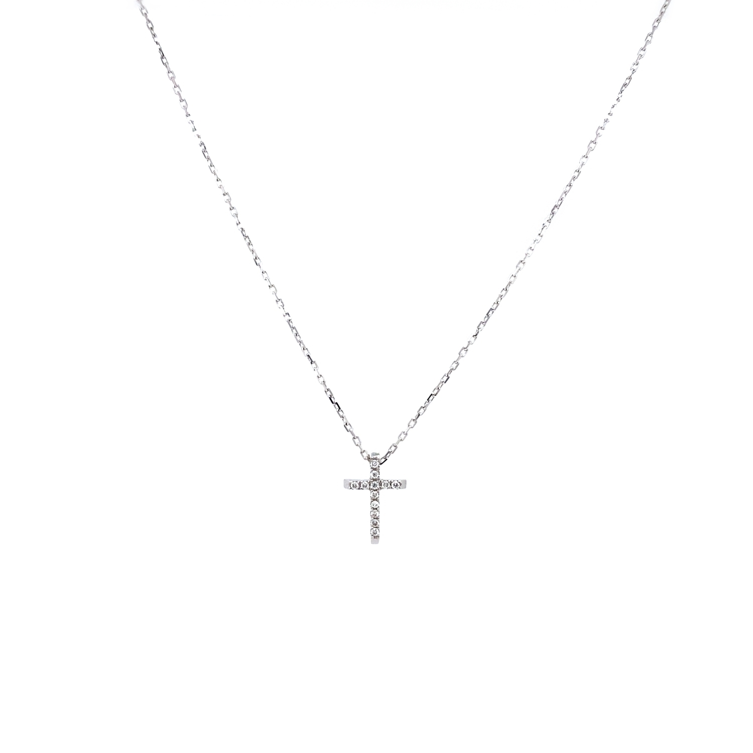 Women's mini cross in 18 karat white gold with white brilliant cut diamonds total weight 0,03ct in G color and VS clarity. Chain length 40cm.