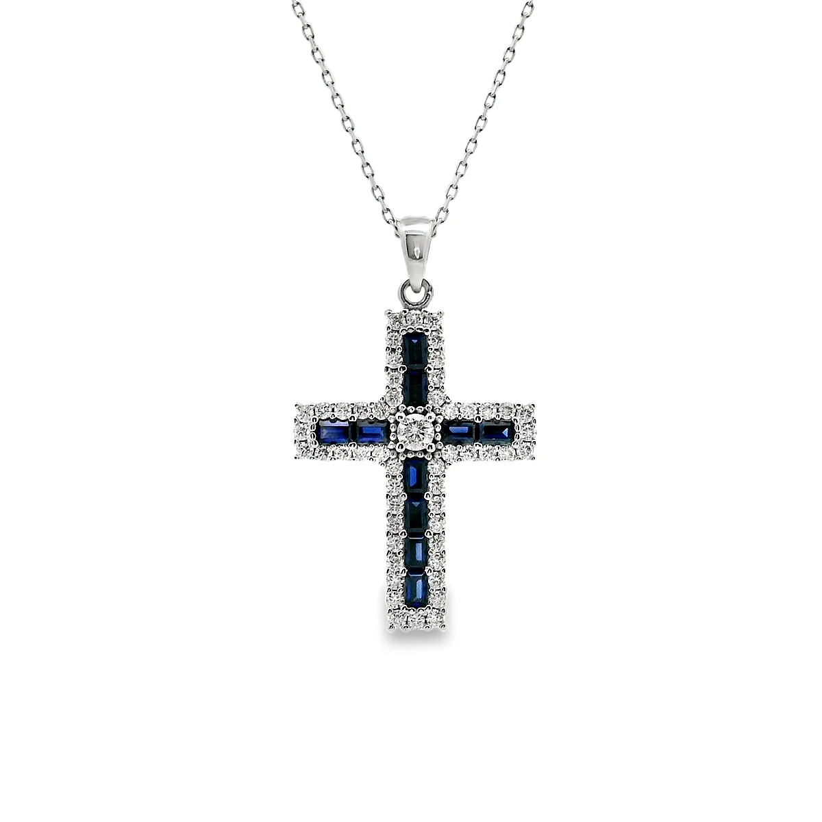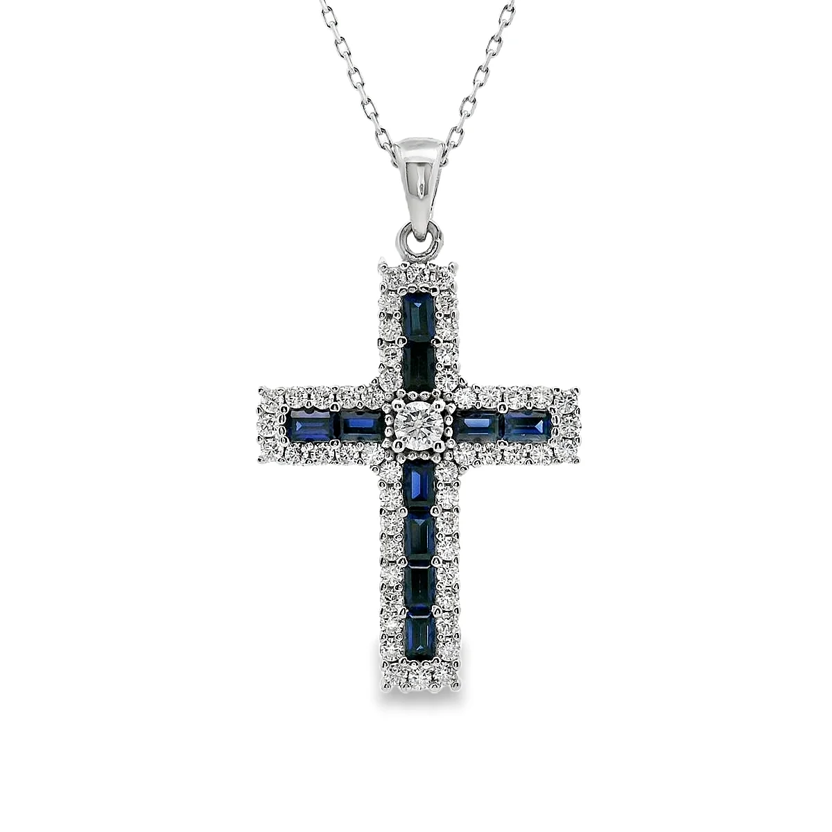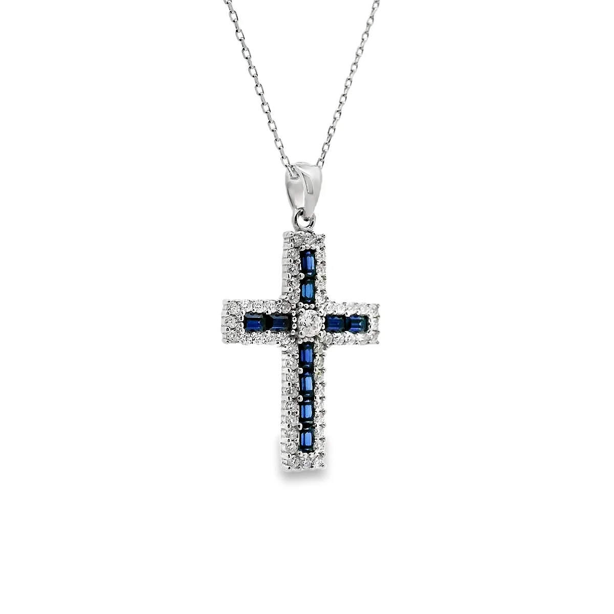 14 karat gold cross with Lab Created blue Sapphires in baguette cut total weight 0.65ct and Lab Created white Sapphires total weight 0.15ct. The chain is sold separately.
