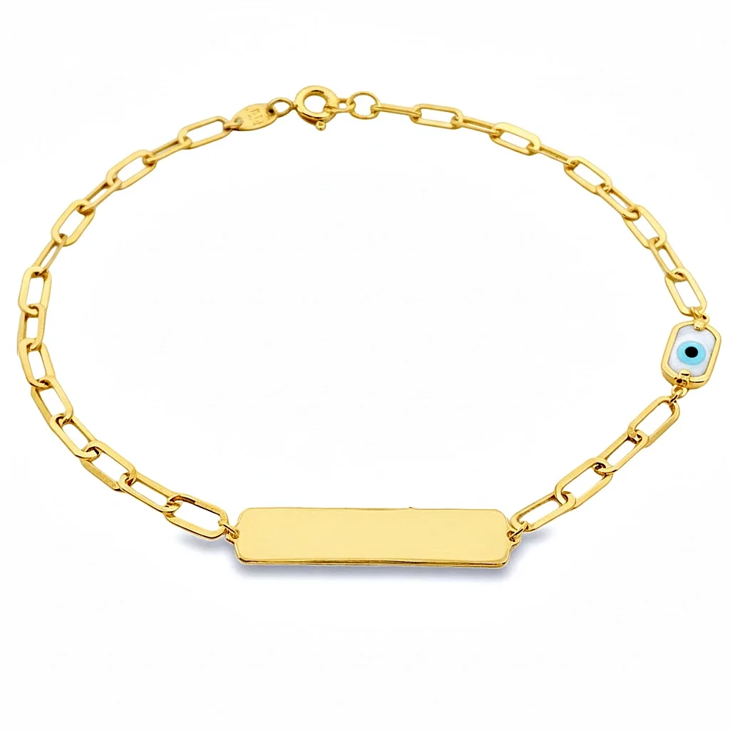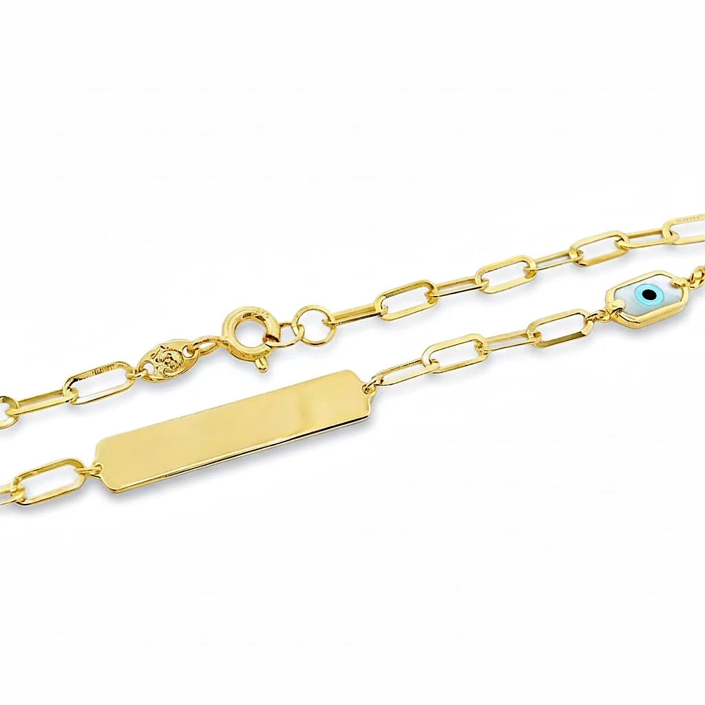 An μοντέρνο and προστατευτικό βραχιόλι ταυτότητα, ιδανικό για αγόρια και κορίτσια, που συνδυάζει την σύγχρονη τάση με τον παραδοσιακό συμβολισμό. Είναι κατασκευασμένο από κίτρινο χρυσό 9 καρατίων και διαθέτει αλυσίδα τύπου Paperclip που προσδίδει μοντέρνο στυλ, μια λεία, ορθογώνια πλάκα στο κέντρο, ιδανική για χάραξη ονόματος, αρχικών ή ημερομηνίας και ένα μικρό ματάκι κρέμεται στην αλυσίδα, προσφέροντας προστασία από το κακό μάτι. Η αλυσίδα είναι ρυθμιζόμενη σε μήκος, εξασφαλίζοντας τέλεια εφαρμογή καθώς το παιδί μεγαλώνει. Ένα πολύτιμο και σύγχρονο δώρο, ένα μοναδικό ενθύμιο για όλη τη ζωή!