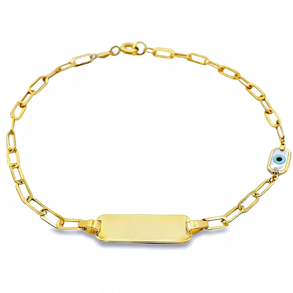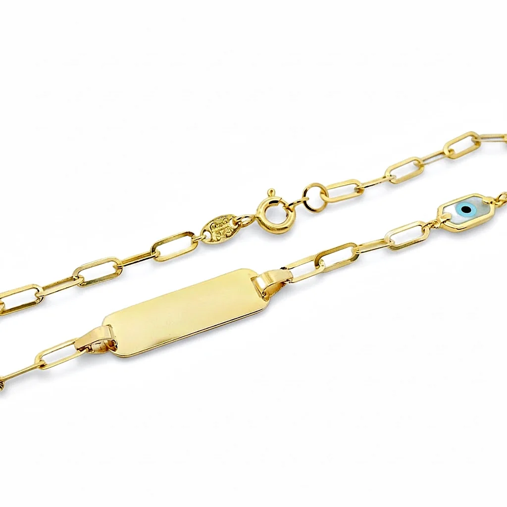 An μοντέρνο and προστατευτικό βραχιόλι ταυτότητα, ιδανικό για αγόρια και κορίτσια, που συνδυάζει την σύγχρονη τάση με τον παραδοσιακό συμβολισμό. Είναι κατασκευασμένο από κίτρινο χρυσό 9 καρατίων και διαθέτει αλυσίδα τύπου Paperclip που προσδίδει μοντέρνο στυλ, μια λεία, ορθογώνια πλάκα στο κέντρο, ιδανική για χάραξη ονόματος, αρχικών ή ημερομηνίας και ένα μικρό ματάκι κρέμεται στην αλυσίδα, προσφέροντας προστασία από το κακό μάτι. Η αλυσίδα είναι ρυθμιζόμενη σε μήκος, εξασφαλίζοντας τέλεια εφαρμογή καθώς το παιδί μεγαλώνει. Ένα πολύτιμο και σύγχρονο δώρο, ένα μοναδικό ενθύμιο για όλη τη ζωή!