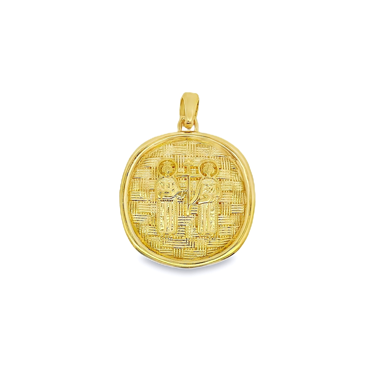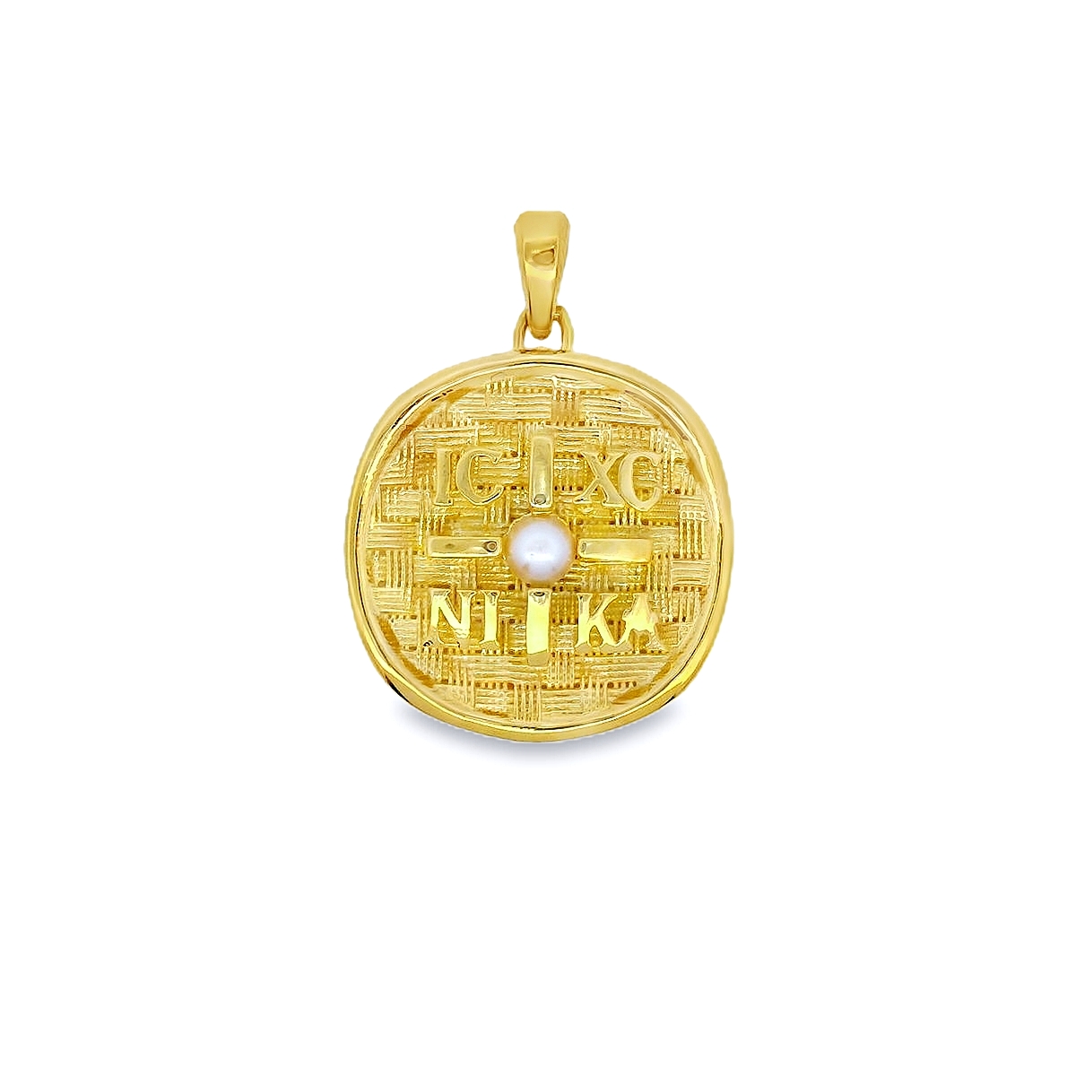 Φυλαχτό κωνσταντινάτο διπλής όψης σε χρυσό 14 καρατίων με μαργαριτάρι.