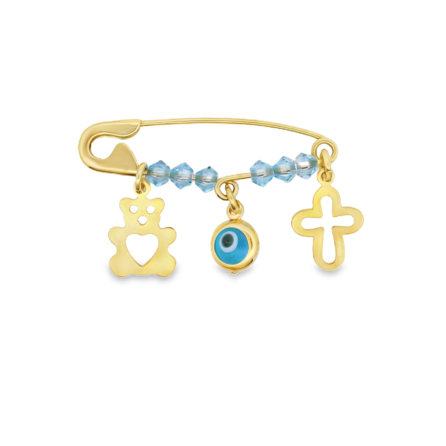 Child's safety pin with teddy bear, eye, cross and light blue crystals in 9 carat gold.