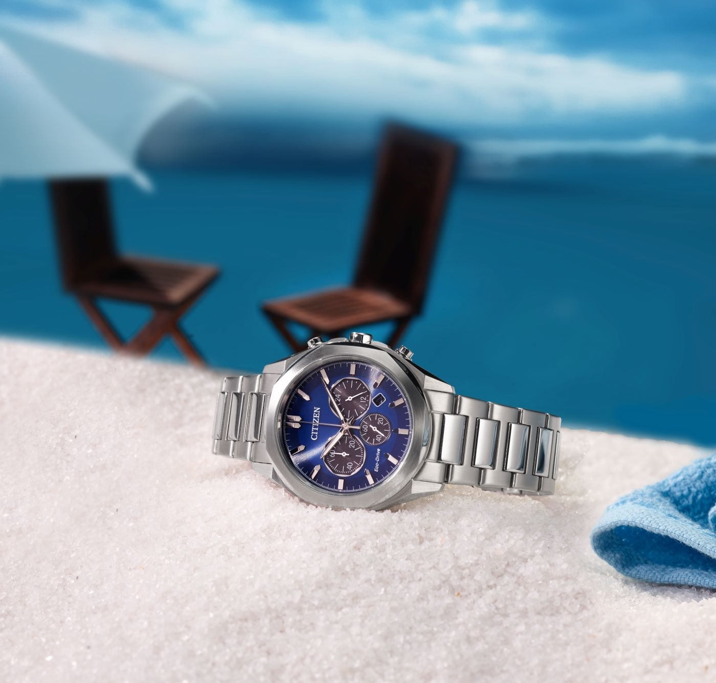 Men's CITIZEN stainless steel watch with blue dial and bracelet, with Eco-Drive mechanism.