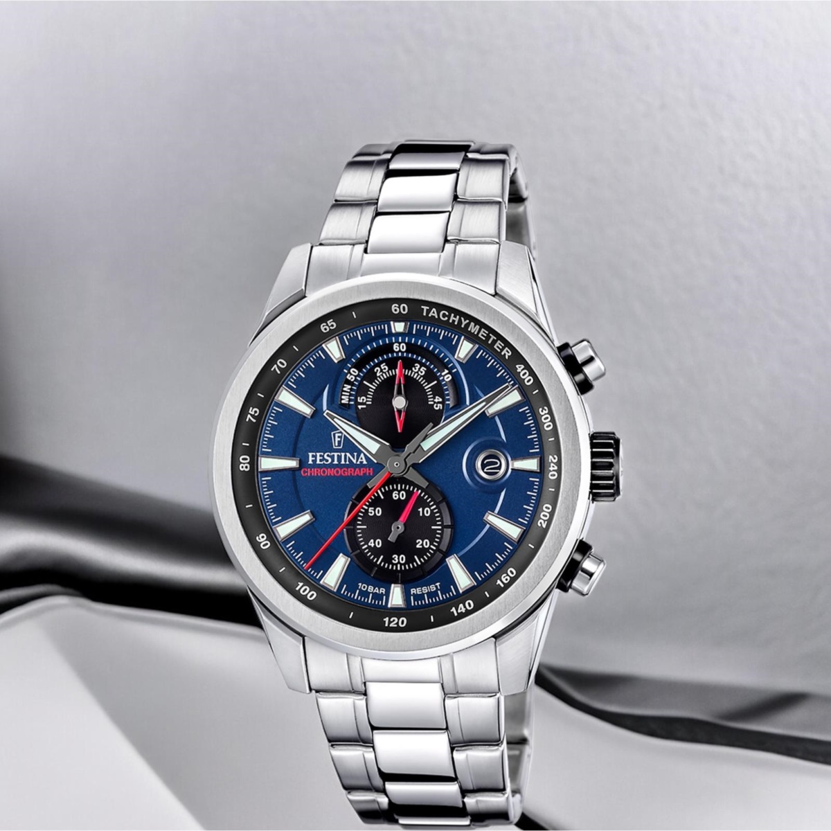 Men's Festina stainless steel watch with blue dial and bracelet.