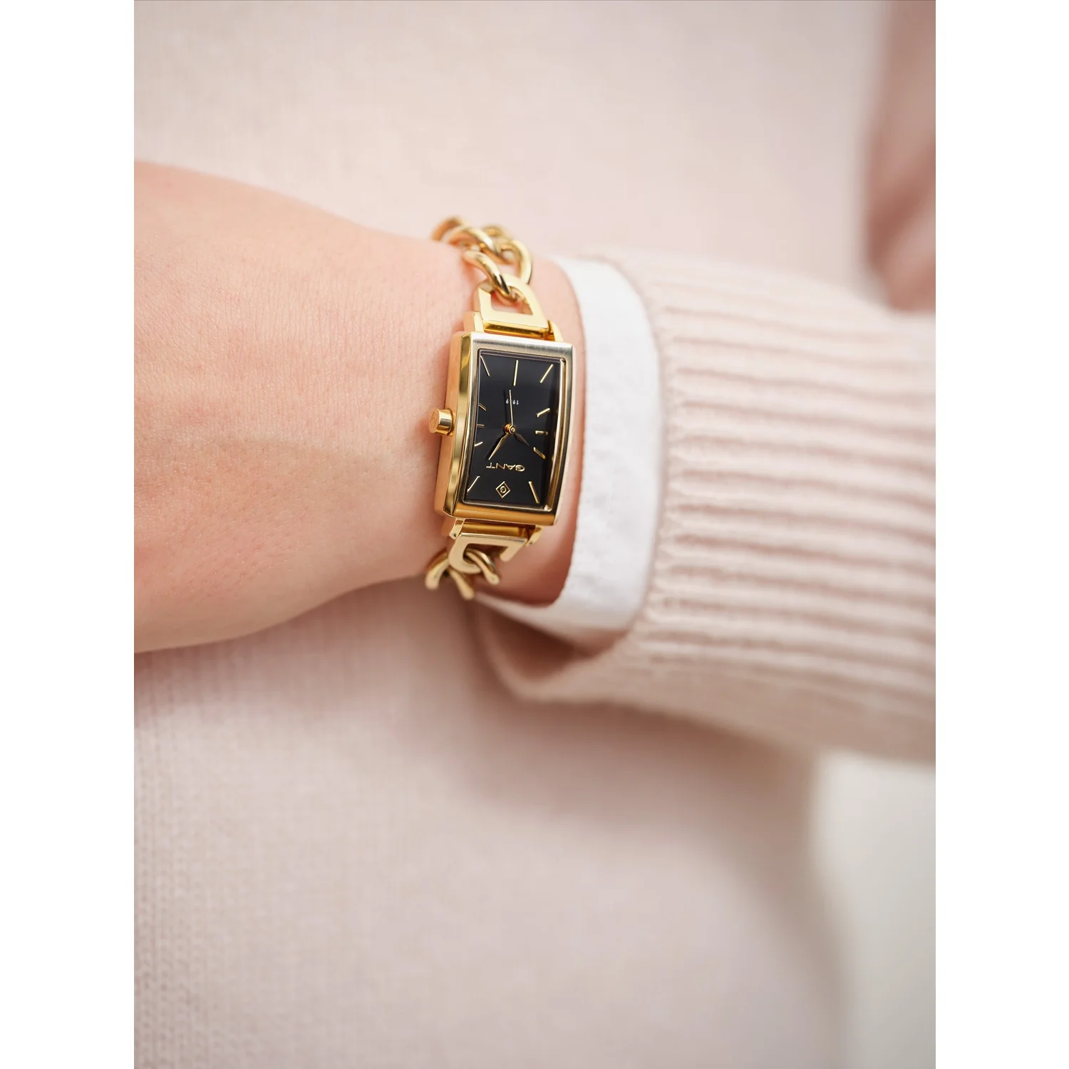 Γυναικείο ρολόι Gant από επίχρυσο ανοξείδωτο ατσάλι με μαύρο καντράν και μπρασελέ αλυσίδα.