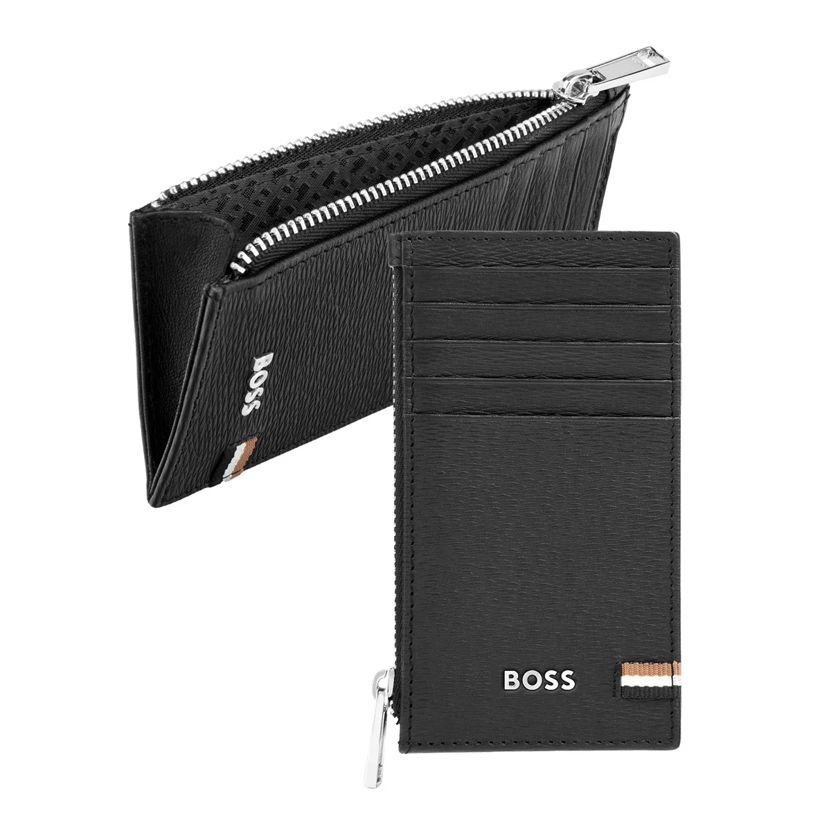 Η εμβληματική σειρά Iconic μικρών δερμάτινων ειδών ξεχωρίζει χάρη στο δέρμα με υφή, το οποίο αναδεικνύεται από μια διακριτική τρίχρωμη λεπτομέρεια στο λουράκι που προσθέτει μια μοντέρνα, casual πινελιά. Κάθε κομμάτι είναι προσεκτικά κατασκευασμένο και φινιρισμένο με μια κομψή χρωμιωμένη πινακίδα με την υπογραφή BOSS και μια φόδρα με μονόγραμμα σε τόνους του ίδιου χρώματος, αντανακλώντας μια αίσθηση πολυτέλειας στα καθημερινά απαραίτητα. Αυτή η θήκη καρτών με φερμουάρ διαθέτει ένα ευρύχωρο διαμέρισμα με πτυχές και πέντε θήκες καρτών στο μπροστινό μέρος, συνδυάζοντας χαλαρό στυλ με λειτουργική κομψότητα.