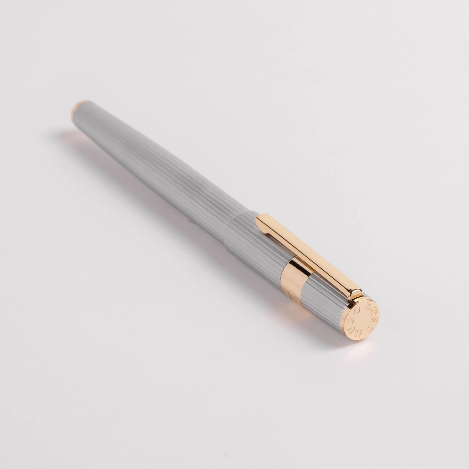Hugo Boss Pens. Our iconic Gear line is reimagined again, this time with an engraved pattern inspired by pinstripes, a signature motif of the HUGO BOSS fashion house, reminiscent of its heritage in the suit. The design is updated with an original surface treatment and a contrasting, polished logo ring placed at the top of the barrel. This light color combination of gold and silver adds a slight retro touch to this otherwise decidedly modern piece.