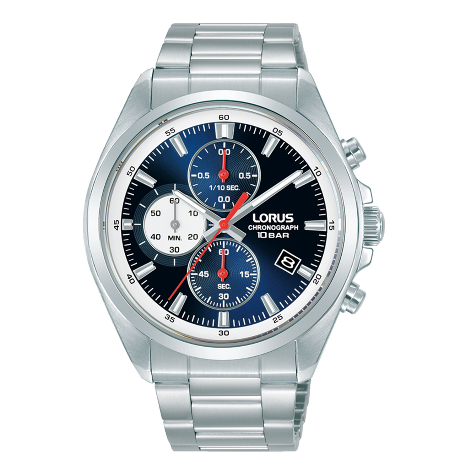 Men's Lorus stainless steel watch with blue dial and bracelet.