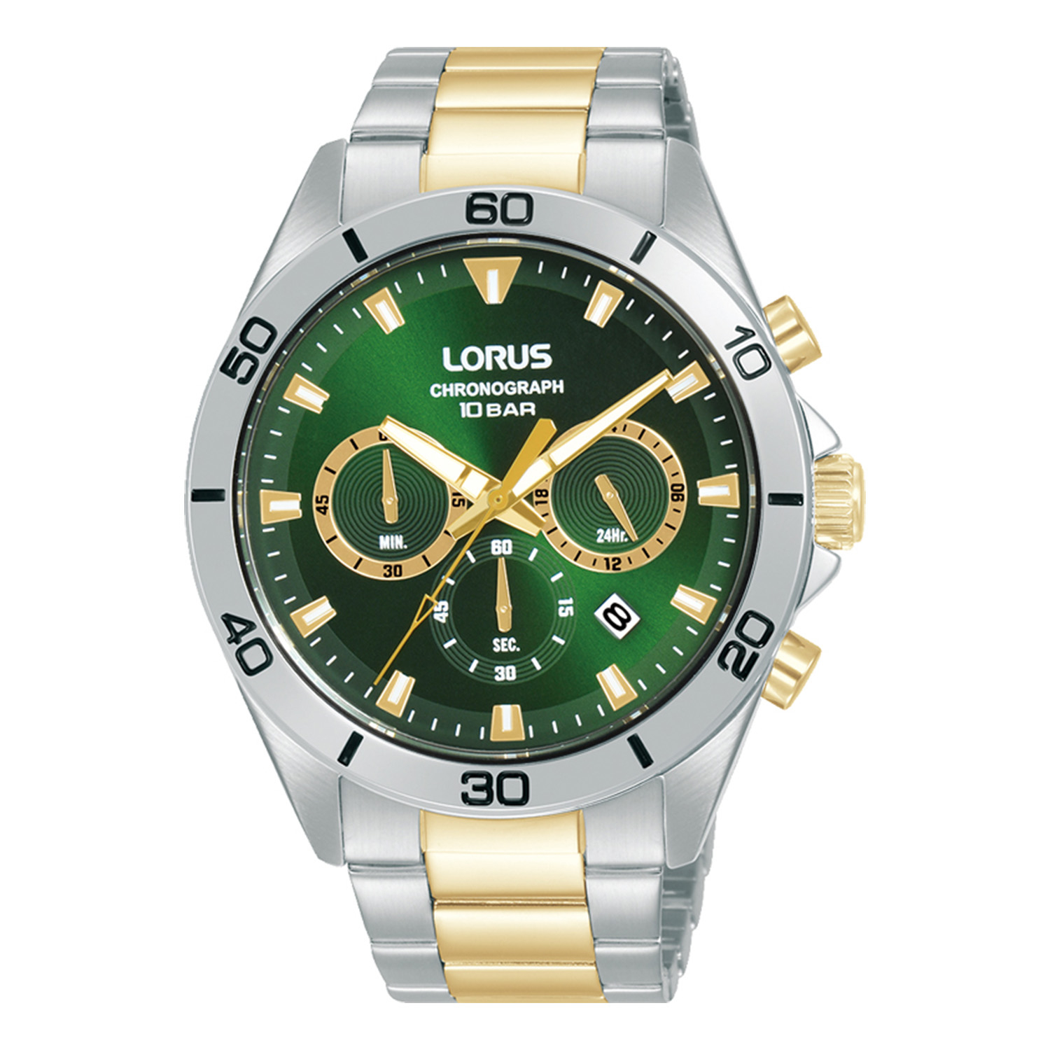Men's Lorus watch in two-tone stainless steel with green dial and bracelet.