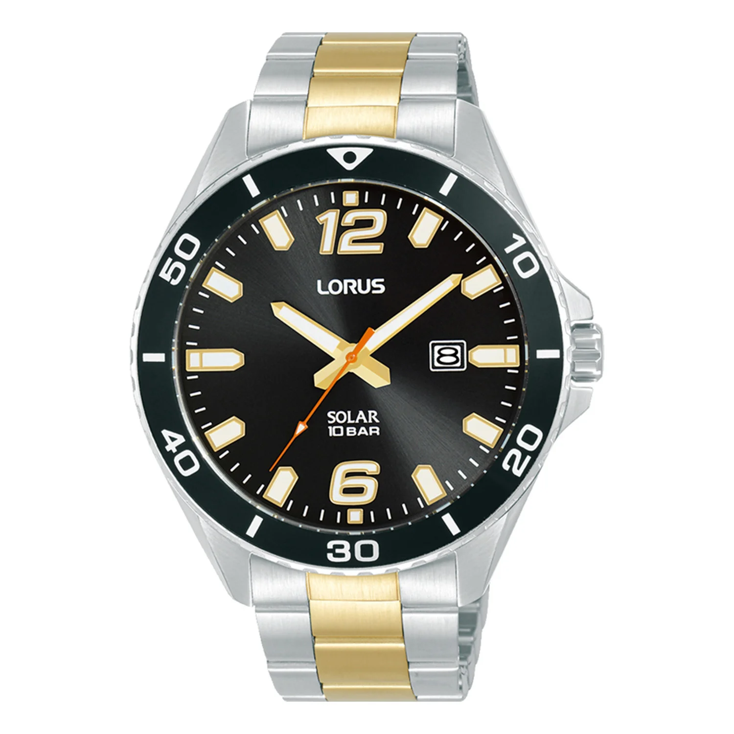 Men's Lorus watch with solar movement, with black dial and bracelet.