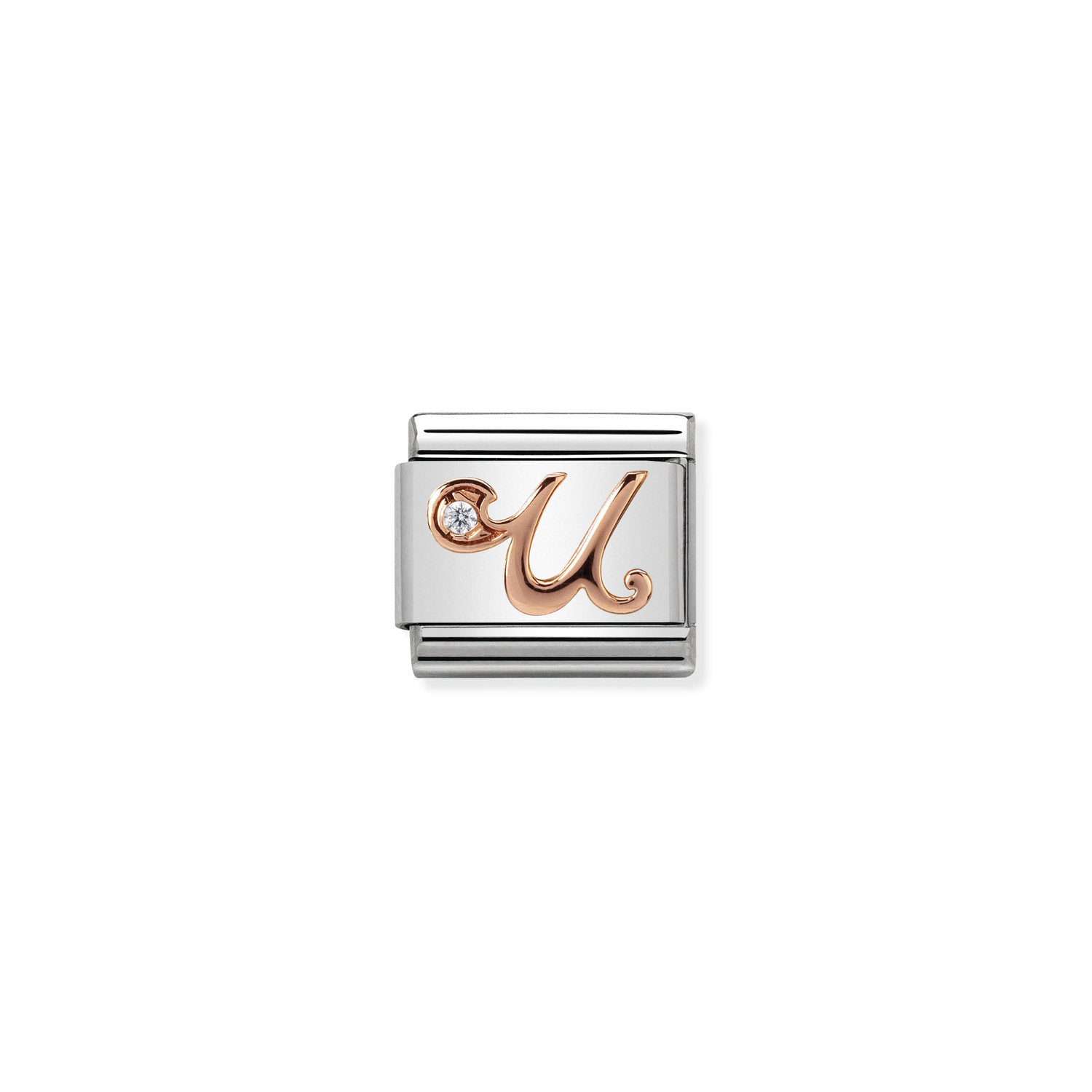 Original Charm for the Composable Classic bracelet with the Letter U in stainless steel, 9K rose gold and white Swarovski Zirconia. We all have someone we hold dear. What are the initials of the person you cherish? Say it with Composable!