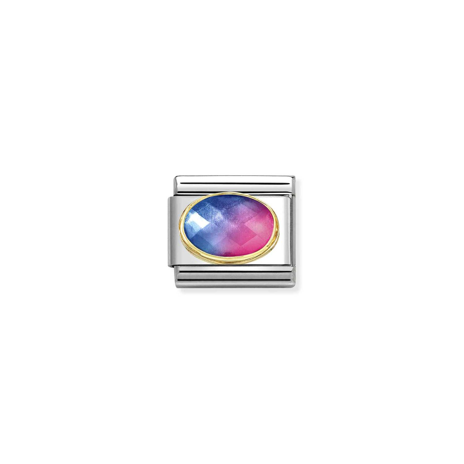 Original Nomination Classic Link in stainless steel with two-tone Blue-Fuchsia faceted glass stone. The stone is hand-set in yellow bonded gold setting. Add some brilliant gradient colour to light up your Composable bracelet to be ready for this non-stop summer.