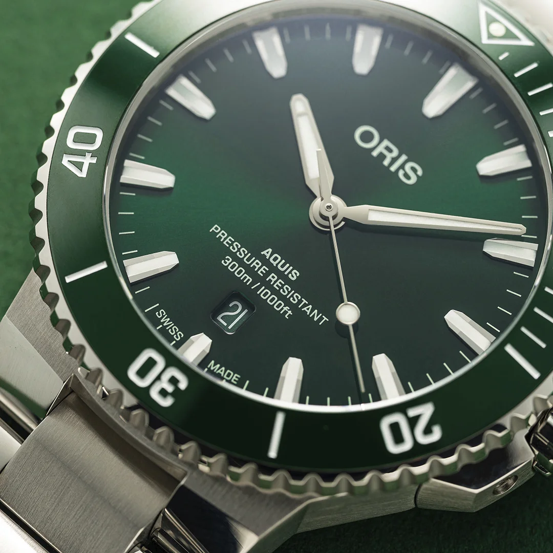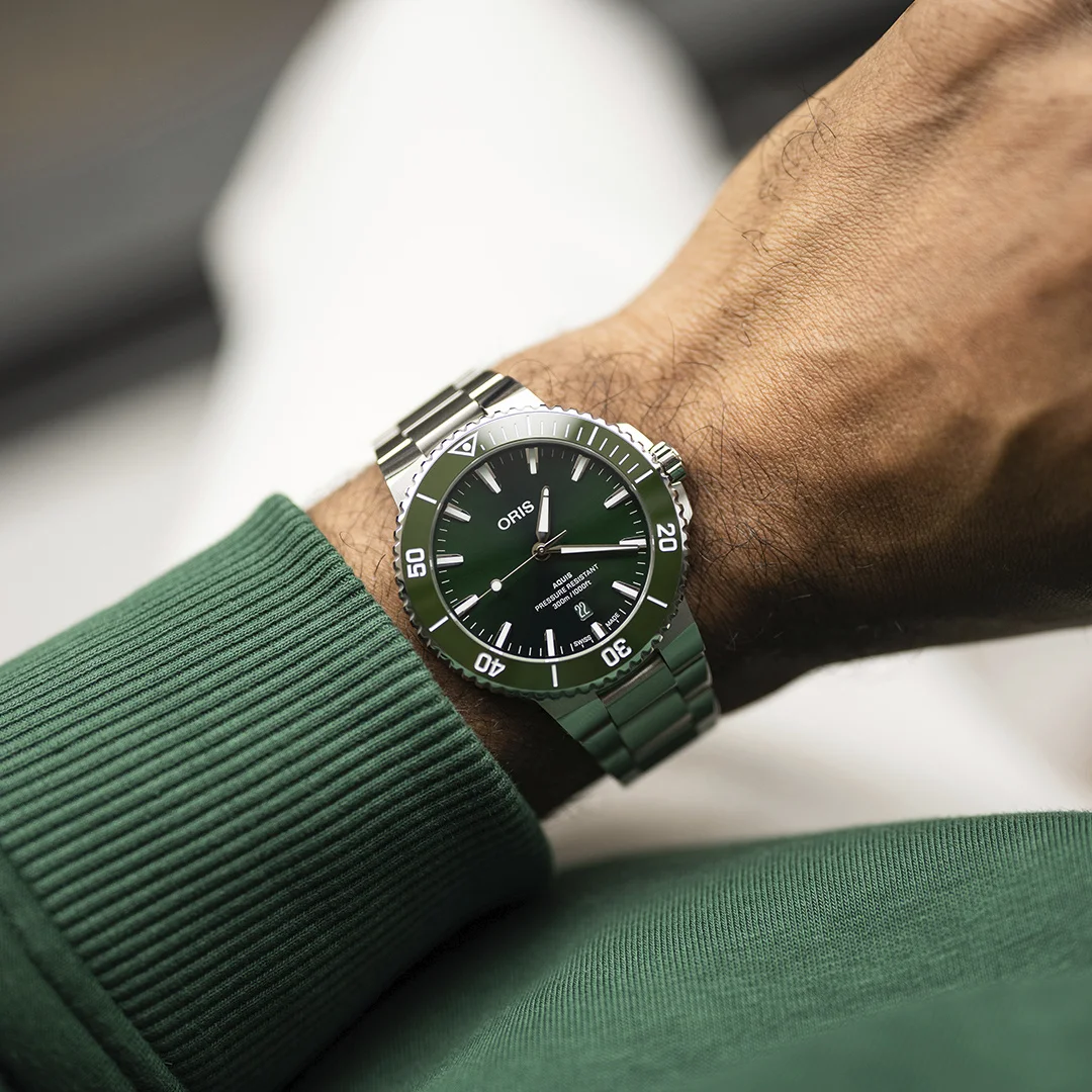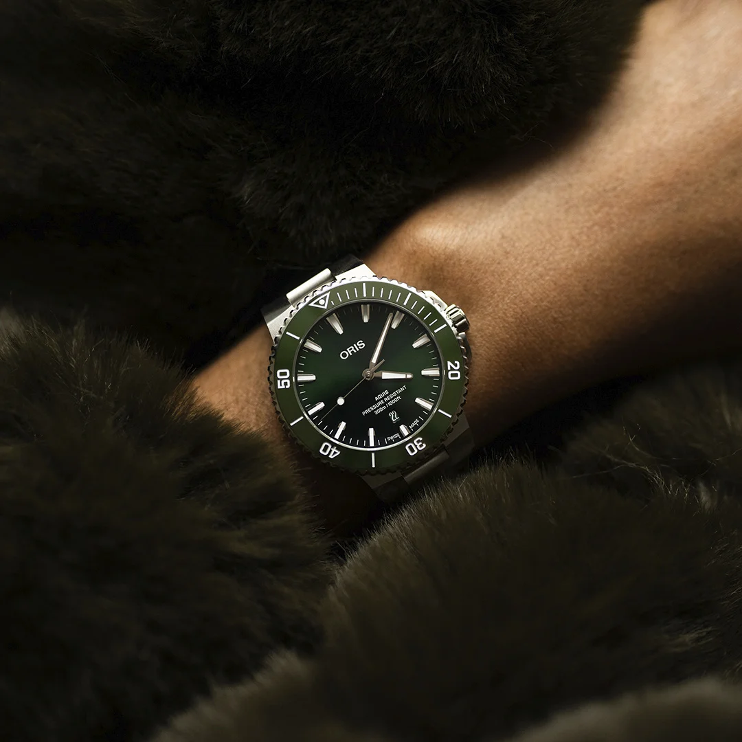 Oris designers have carefully created a stylish, thoughtful colour palette so that Oris' renowned dive watches offer more choices for the consumer. The new watches offer dial, bezel and strap combinations in green, black and brown colours, with a variety of straps and bracelets. So, it has never been easier to find the Aquis Date that suits one's personality. Beyond the aesthetic aspect, the new Aquis Date remains a high-performance dive watch, with a 43.5 mm stainless steel case and a unidirectional rotating bezel with a wear-resistant ceramic coating. They are water resistant to 30 bar/ 30 ATM/ 300 metres and are powered by a Swiss Made automatic movement with date indication at 6 o'clock.