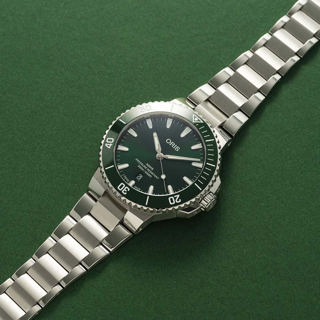 Men's watch ORIS of Swiss manufacture, with automatic movement, made of stainless steel with green dial and bracelet.