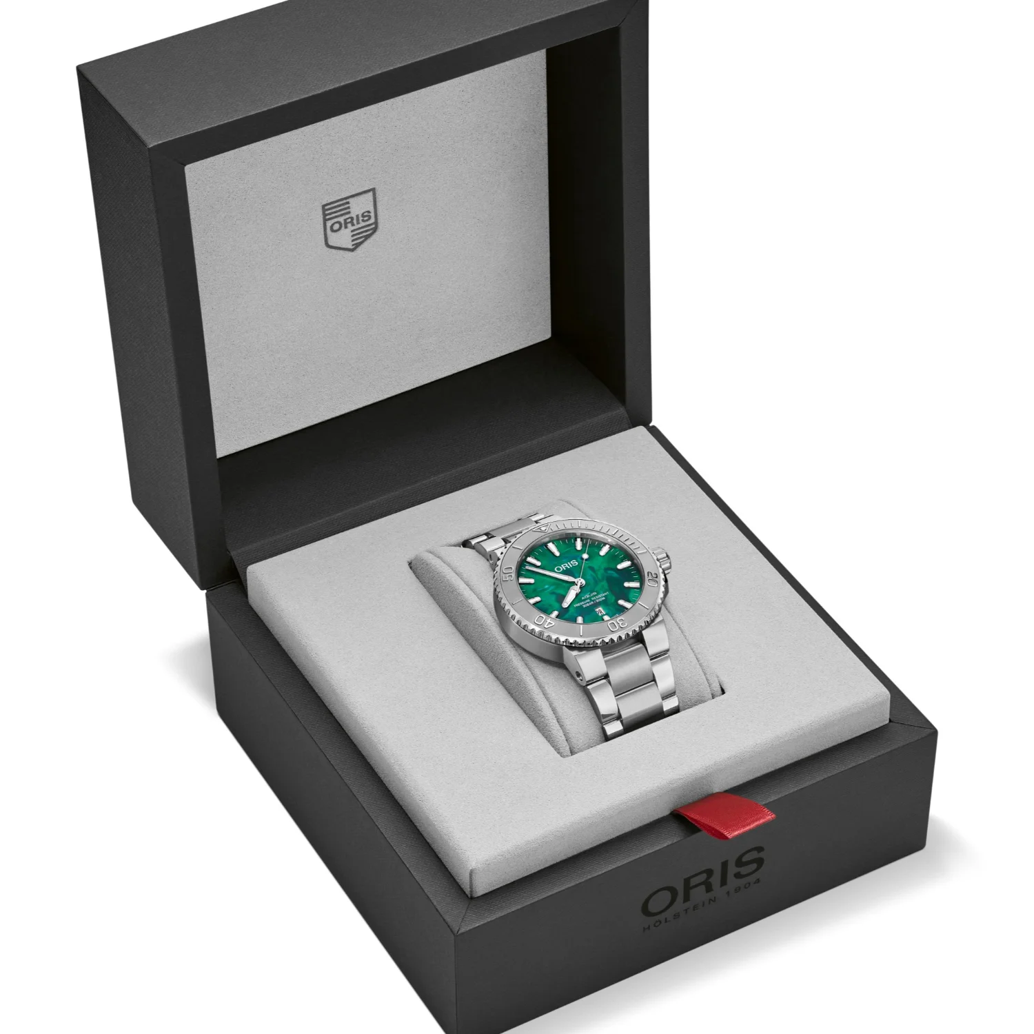 Men's watch ORIS of Swiss manufacture, with automatic movement, made of stainless steel with green dial and bracelet.