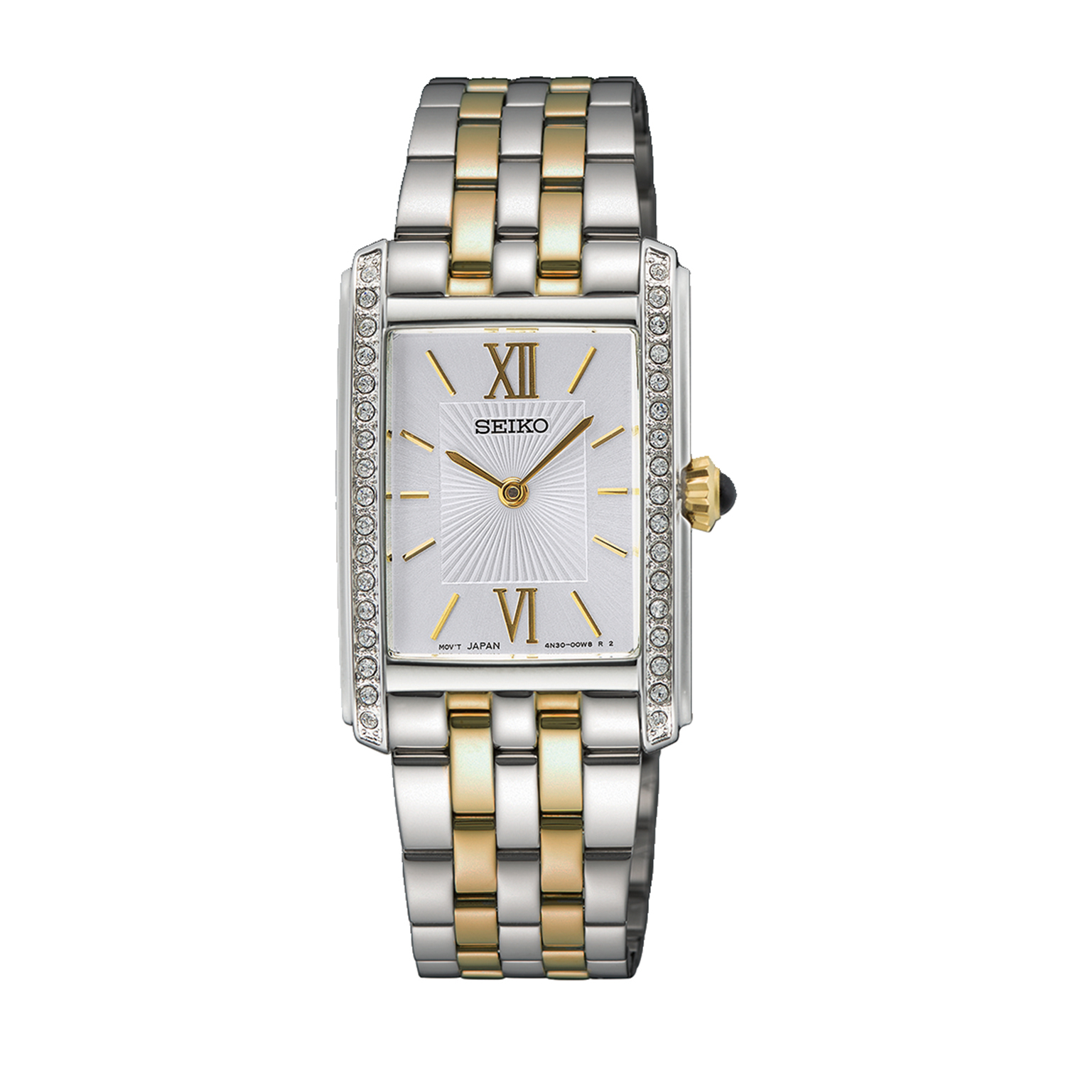 From the Essentials collection. A refined classic, perfectly proportioned to look like jewellery, this elegant watch features a rectangular case decorated with 34 crystals, a white dial with Roman numerals and gold hands and a blue cabochon crown. Crafted from stainless steel in a versatile two-tone finish, this graceful design includes a five-row stainless steel bracelet for a comfortable and elegant feel