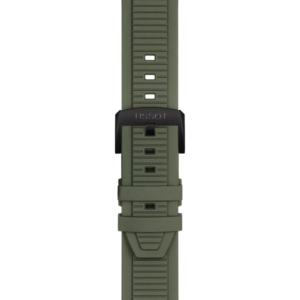 Men's Tissot Swiss made stainless steel Tissot watch with black dial and dark green silicone strap.