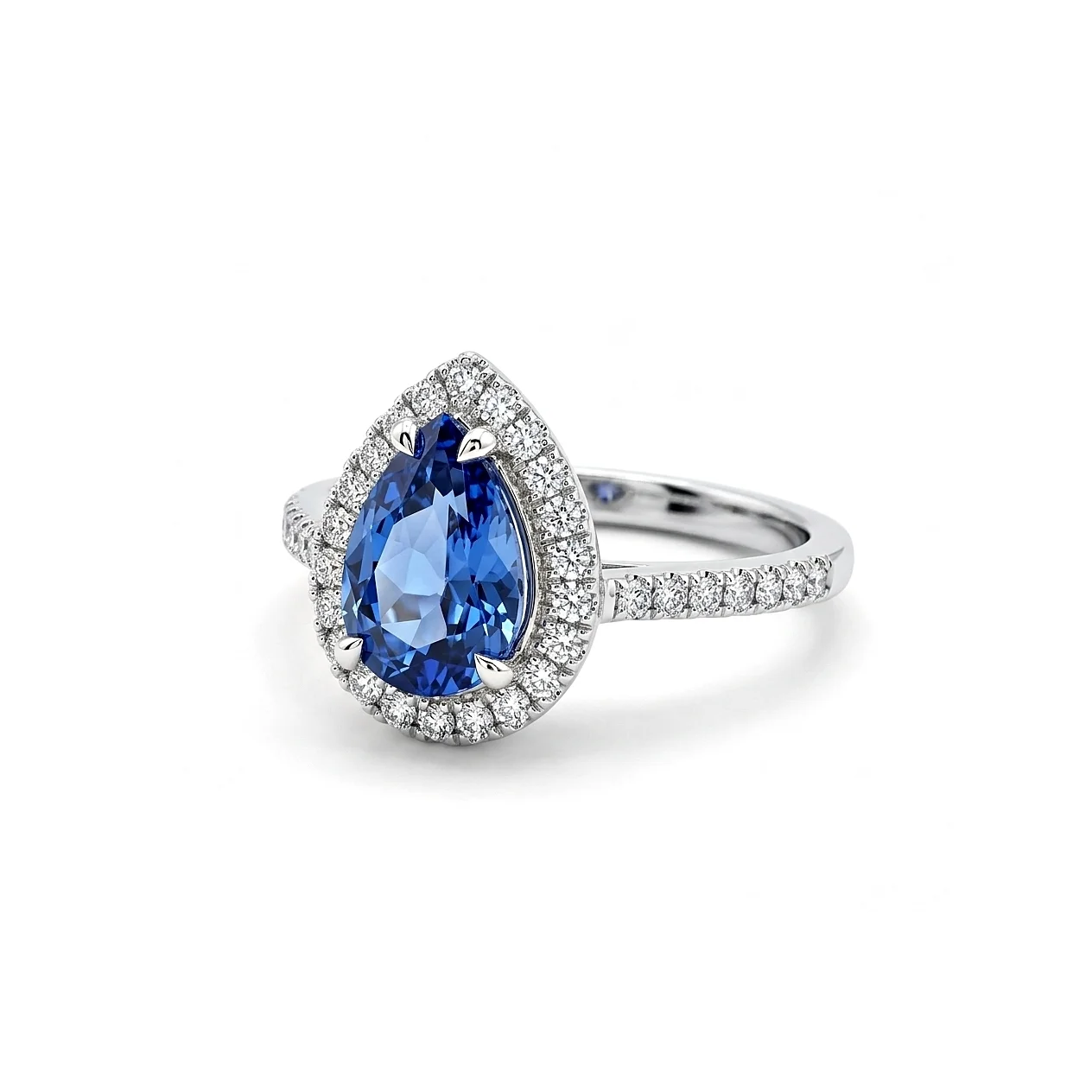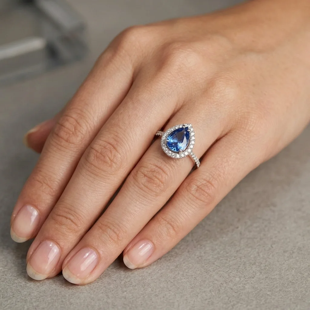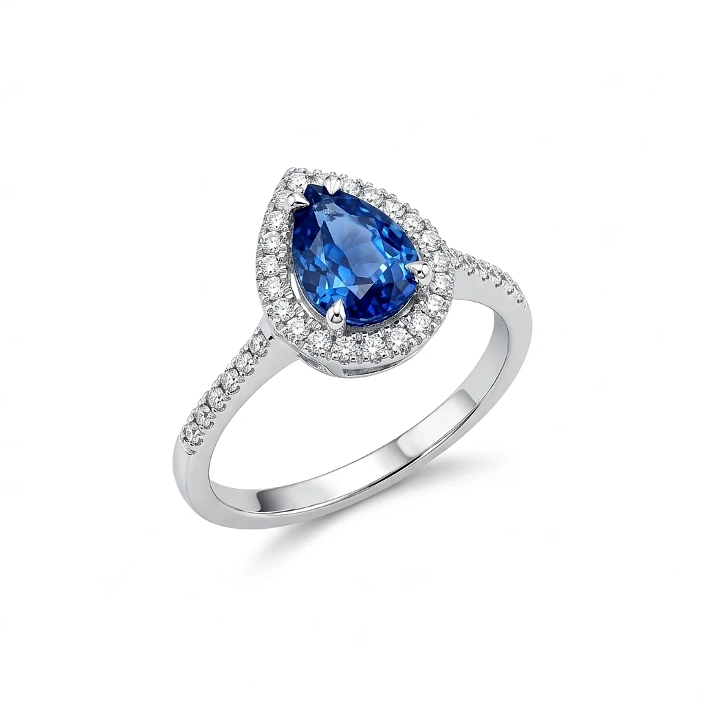 Η επιτομή της διαχρονικής πολυτέλειας. Αυτό το εξαιρετικό δαχτυλίδι από λευκό χρυσό 18 καρατίων φιλοξενεί ένα εντυπωσιακό φυσικό μπλε ζαφείρι σε Pear κοπή, πλαισιωμένο από τη μοναδική λάμψη των διαμαντιών Brilliant. Κλασική ροζέτα με “halo” δέσιμο, επάνω σε μια στιβαρή και κομψή γάμπα που αναδεικνύει το μέγεθος και το βάθος του κεντρικού λίθου. Με το ζαφείρι να αγγίζει το 1.01 ct, το κόσμημα αυτό αποκτά ιδιαίτερη αξία και επιβλητική παρουσία στο χέρι. Ο συνδυασμός του λευκού χρυσού με το “royal blue” χρώμα του ζαφειριού προσδίδει μια αίσθηση αριστοκρατικής καθαρότητας. Αποτελεί την ιδανική πρόταση για ένα πολύτιμο δαχτυλίδι αρραβώνων ή για ένα δώρο επετείου που θα μείνει αναλλοίωτο στον χρόνο.