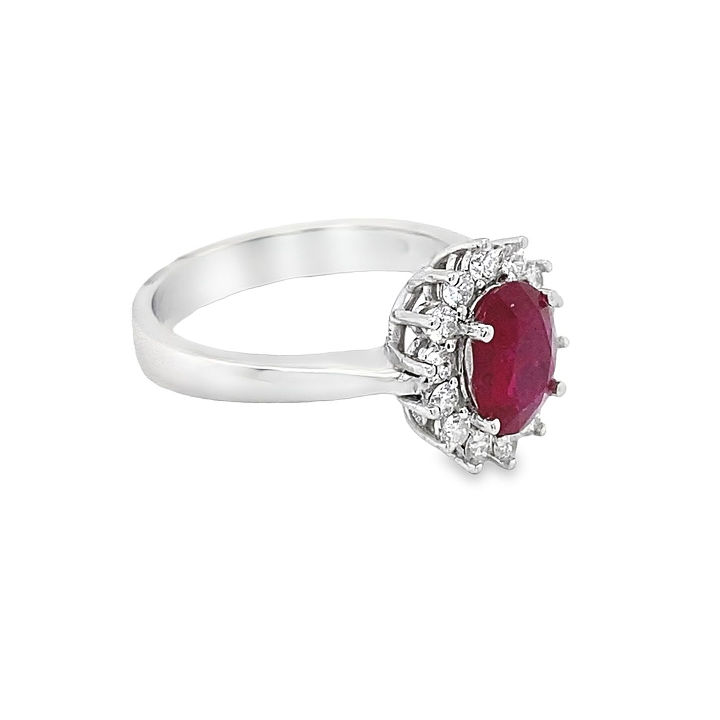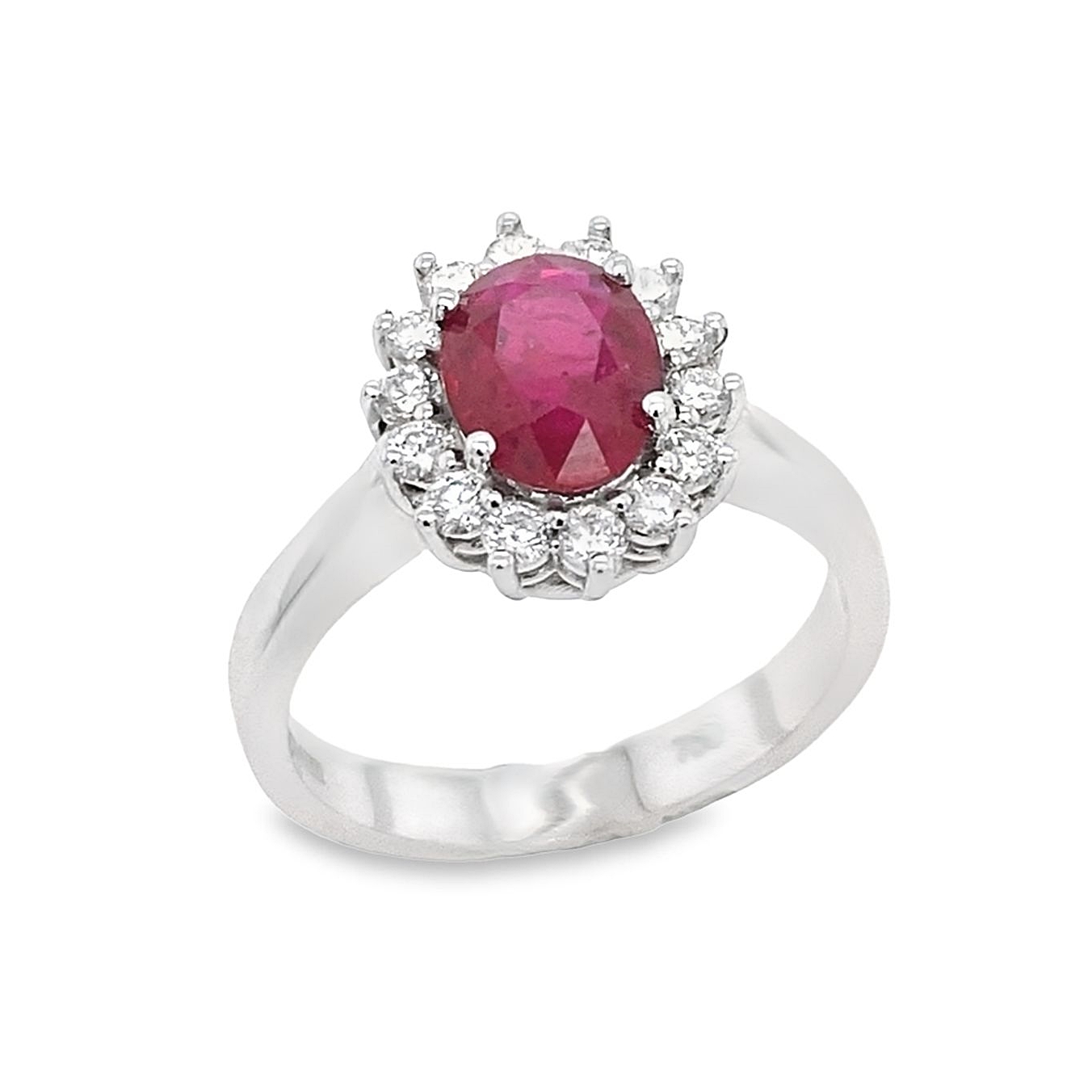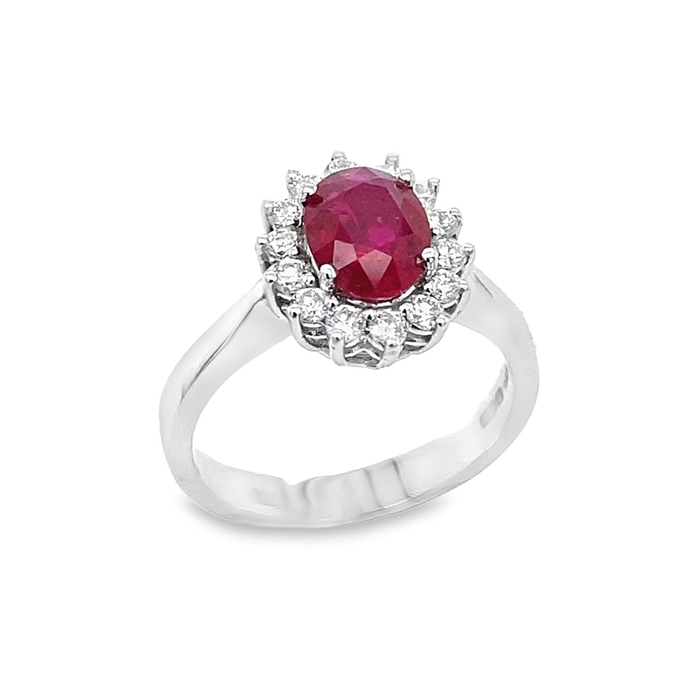 Δακτυλίδι σε λευκό χρυσό 18 καρατίων με ρουμπίνι 1,33ct στο κέντρο και λευκά διαμάντια περιμετρικά 0,37ct.