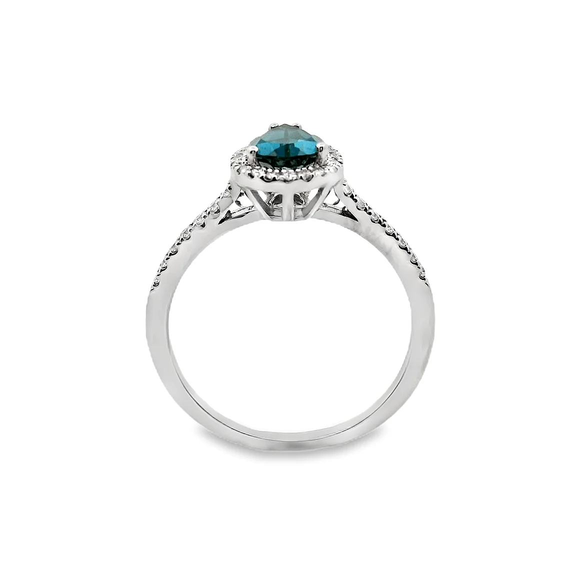 Δακτυλίδι ροζέτα σε λευκό χρυσό 18 καρατίων με London Blue Τοπάζι σε κοπή pear βάρους 0.79ct και λευκά διαμάντια περιμετρικά συνολικού βάρους 0.14ct χρώματος G και καθαρότητας VS.