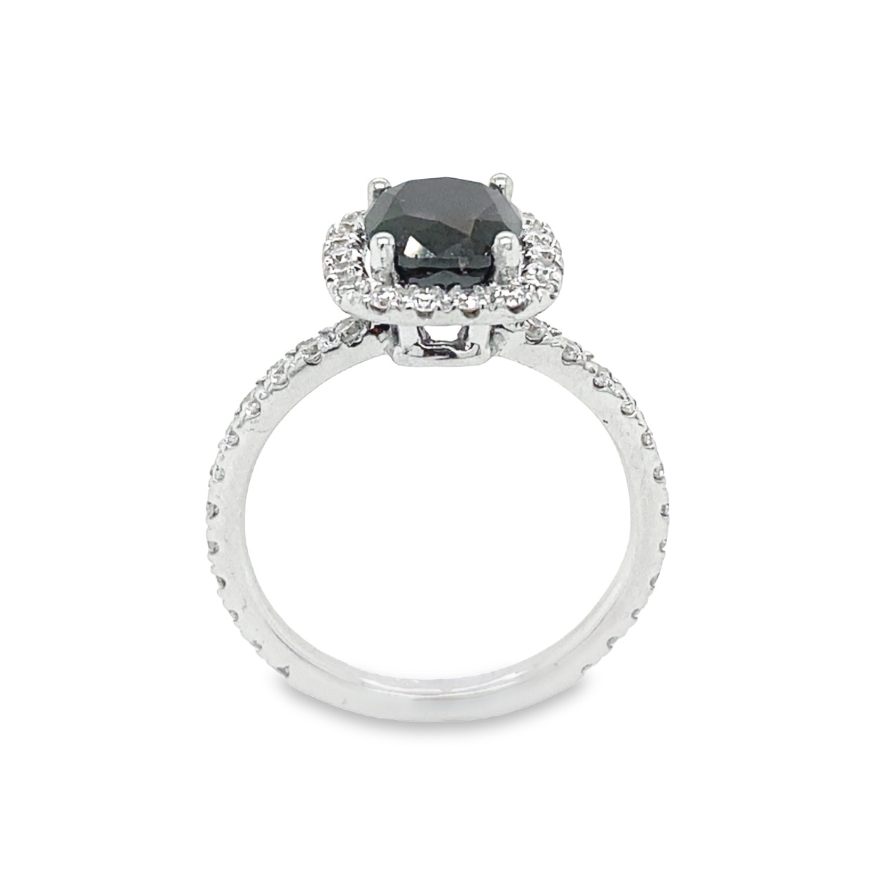 Μονόπετρο δακτυλίδι σε λευκόχρυσο 18 καρατίων με μαύρο διαμάντι 1,80ct στο κέντρο και λευκά διαμάντια συνολικού βάρους 0,59ct. Σας παρουσιάζουμε αυτό το εξαίσιο δαχτυλίδι με τα ασπρόμαυρα διαμάντια, ένα πραγματικό αριστούργημα που αποπνέει διαχρονική κομψότητα και πολυτέλεια. Αυτό το εκπληκτικό κομμάτι διαθέτει μια μαγευτική αντίθεση από αστραφτερά λευκά διαμάντια, που έχουν τοποθετηθεί σχολαστικά σε ένα στεφάνι που περιβάλλει ένα εντυπωσιακό, δραματικό κέντρο με μαύρο διαμάντι. Η όμορφα επεξεργασμένη γάμπα διαθέτει ένα περίτεχνο σχέδιο, στολισμένο με λαμπερά λευκά διαμάντια που αγκαλιάζουν με χάρη το δάχτυλο. Αυτό το πολυτελές statement κομμάτι υπόσχεται να συλλάβει την ουσία του εκλεπτυσμένου στυλ και να αιχμαλωτίσει τις καρδιές όλων όσων το αντικρίζουν.
