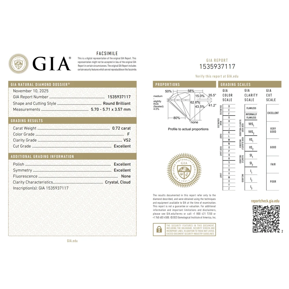 Το διαμάντι, βάρους 0.72 καρατίων, συνοδεύεται από το κορυφαίο πιστοποιητικό του Γεωμολογικού Ινστιτούτου Αμερικής (GIA) και διαθέτει τα ιδανικά χαρακτηριστικά “Triple Excellent” (Άριστη Κοπή, Άριστο Γυάλισμα, Άριστη Συμμετρία) με μηδενικό φθορισμό. Αυτό εξασφαλίζει τη μέγιστη δυνατή αντανάκλαση του φωτός, προσφέροντας ασύγκριτη λάμψη που μαγνητίζει τα βλέμματα. Ένα κόσμημα-επένδυση, φτιαγμένο για να περάσει από γενιά σε γενιά.