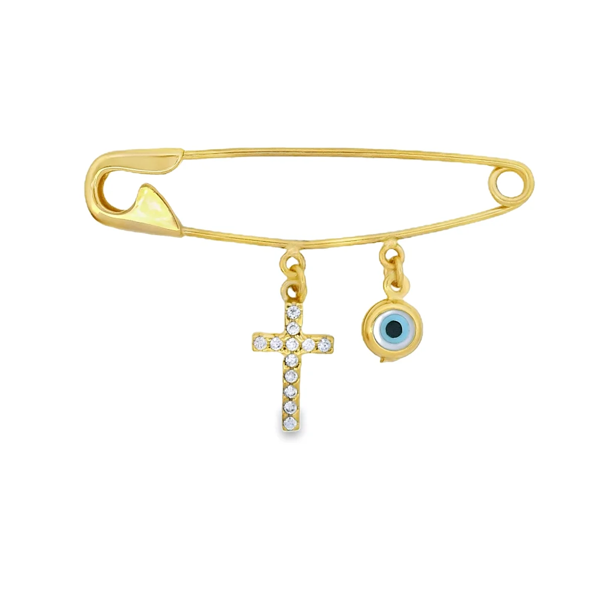 Φυλαχτό παραμάνα παιδική με σταυρό διακοσμημένο με ζιργκόν και ματάκι σε χρυσό 9 καρατίων.