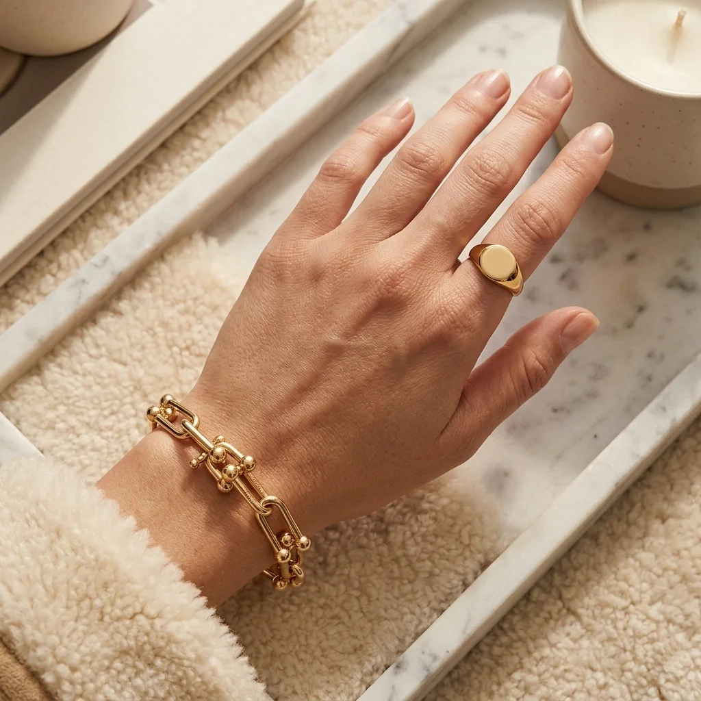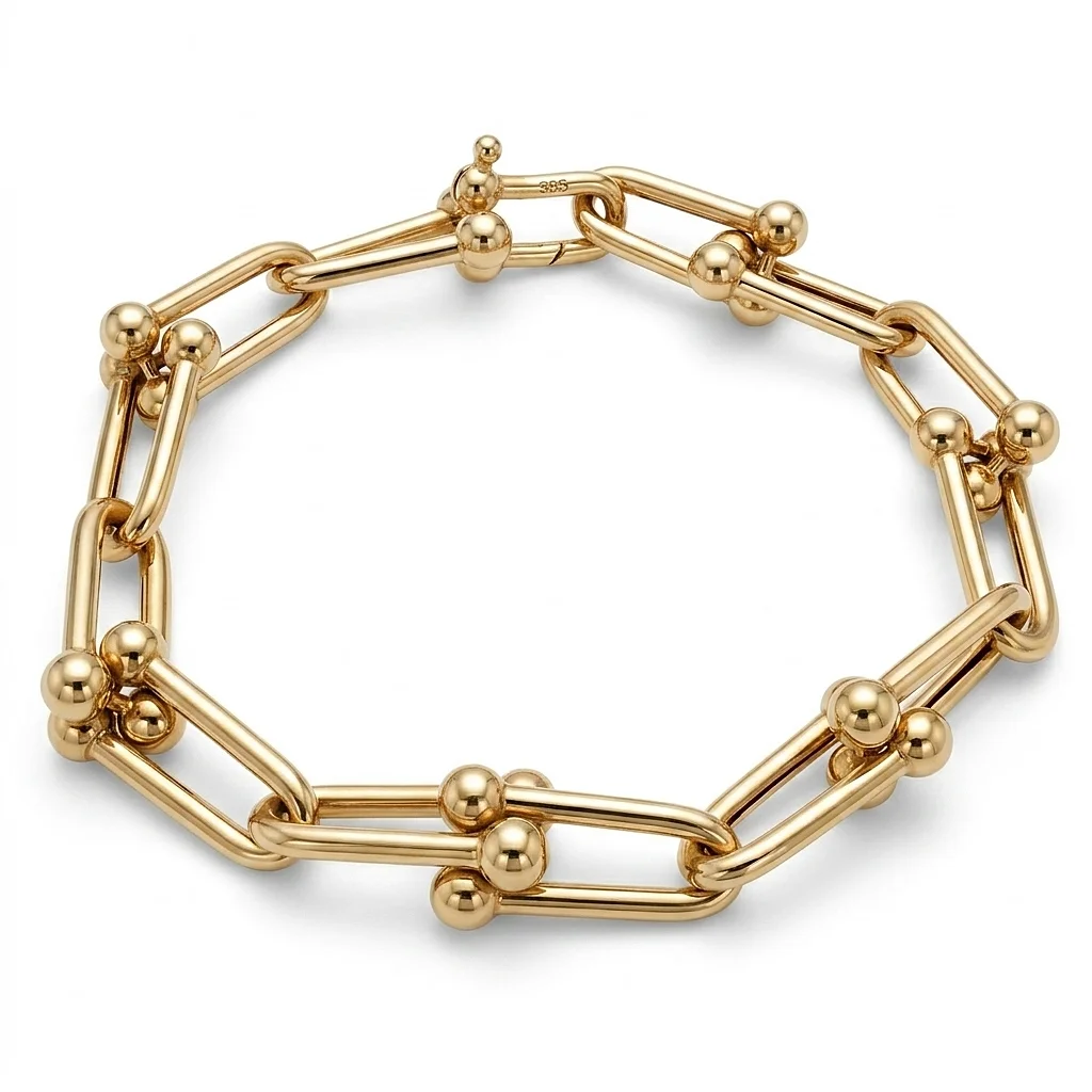 Αυτό το εντυπωσιακό βραχιόλι από χρυσό 14 καρατίων είναι η επιτομή του “bold luxury”. Αποτελείται από μεγάλους, λείους οβάλ κρίκους σε στιβαρή πλέξη, προσφέροντας μια αίσθηση αυτοπεποίθησης και διαχρονικού στυλ σε κάθε κίνηση του καρπού. Αποτελεί ένα πραγματικό statement κόσμημα που ξεχωρίζει για την ποιότητα και την λάμψη του. Η καθαρή, λουστρέ επιφάνεια των κρίκων αντανακλά το φως με μοναδικό τρόπο, καθιστώντας το ιδανικό για να φορεθεί μόνο του ως το κύριο αξεσουάρ της εμφάνισής σας.
