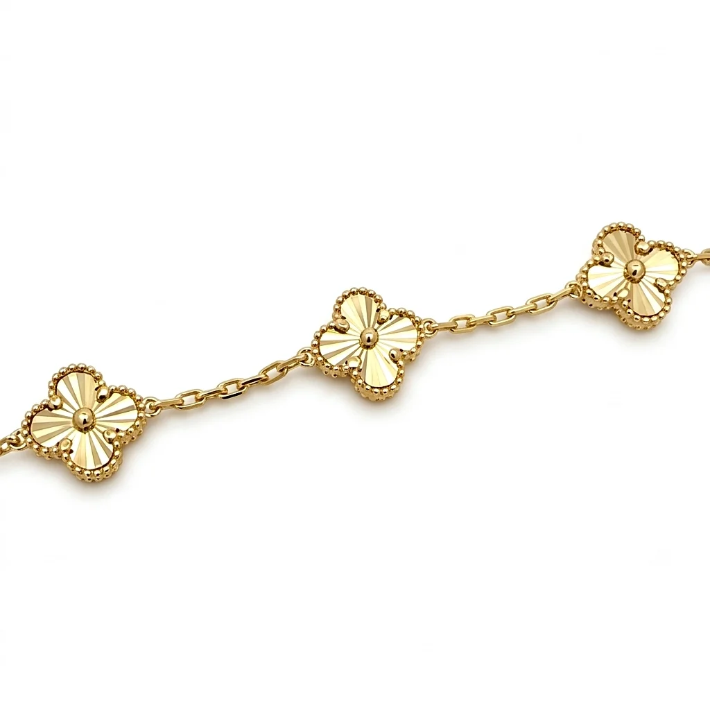 Αναδείξτε τη θηλυκότητά σας με αυτό το κομψό και διακριτικό βραχιόλι 14 καρατίων, που συνδυάζει την υψηλή αισθητική με το συμβολισμό της καλής τύχης. Σχεδιασμένο για τη γυναίκα που αγαπά την εκλεπτυσμένη πολυτέλεια, το κόσμημα αυτό ξεχωρίζει για την λεπτομέρεια και τη λάμψη του. Το βραχιόλι κοσμείται από τρία μοτίβα σε σχήμα τετράφυλλου τριφυλλιού, φιλοτεχνημένα με την εντυπωσιακή τεχνική εγχάραξης guilloché. Οι ακτινωτές γραμμές στο εσωτερικό των μοτίβων αιχμαλωτίζουν και διαχέουν το φως, δημιουργώντας ένα δυναμικό οπτικό εφέ. Το περίγραμμα με τη λεπτομέρεια milgrain προσθέτει μια vintage νότα, ολοκληρώνοντας τον πολυτελή χαρακτήρα του. Η παρουσία τριών μοτίβων το καθιστά ιδανικό για καθημερινή χρήση, προσφέροντας λάμψη χωρίς να είναι υπερβολικό. Λόγω της λεπτής του γραμμής, συνδυάζεται άψογα με άλλα βραχιόλια ή το ρολόι σας για ένα μοντέρνο look. Ένα διαχρονικό δώρο με βαθύ συμβολισμό, έτοιμο να προσφερθεί σε πολυτελή συσκευασία.