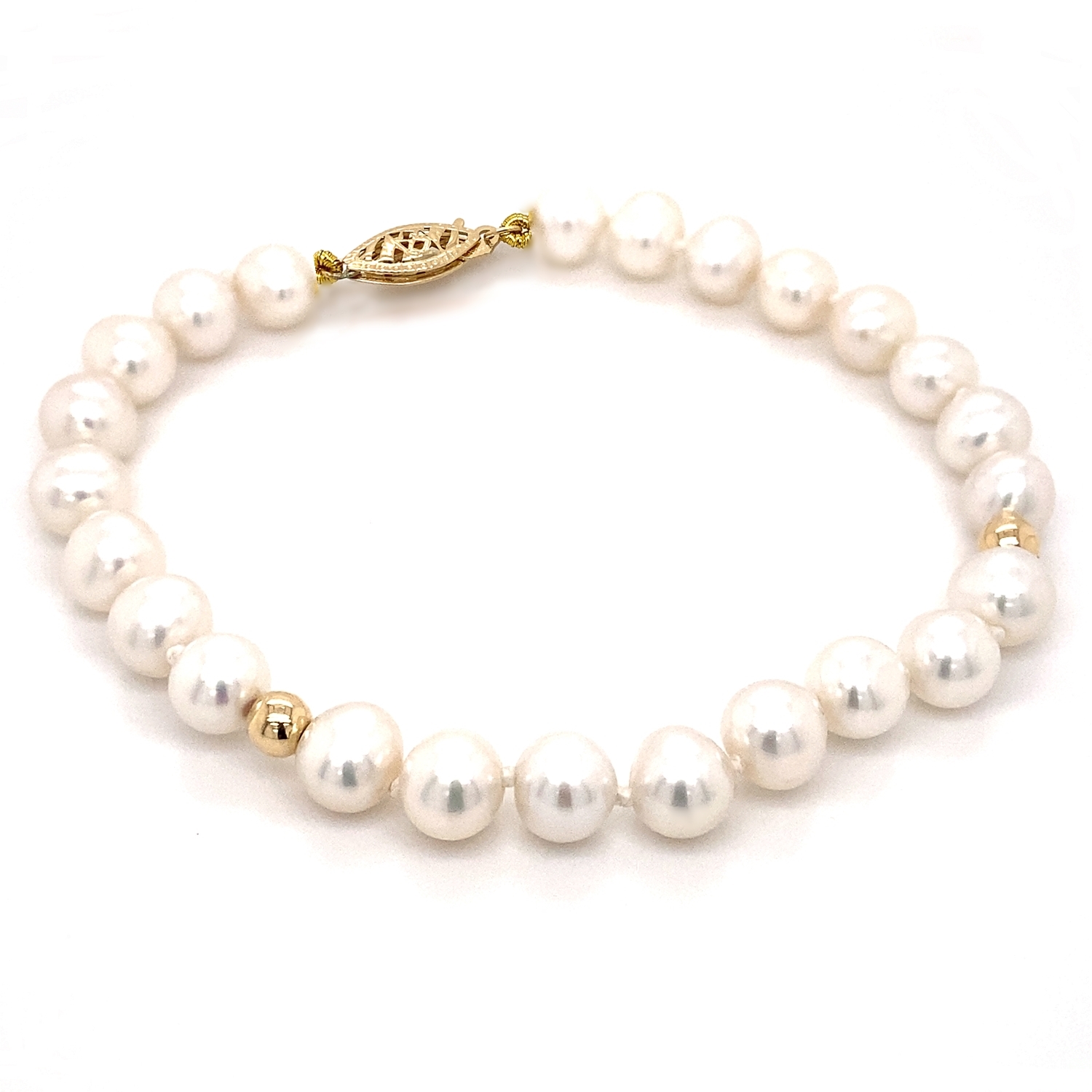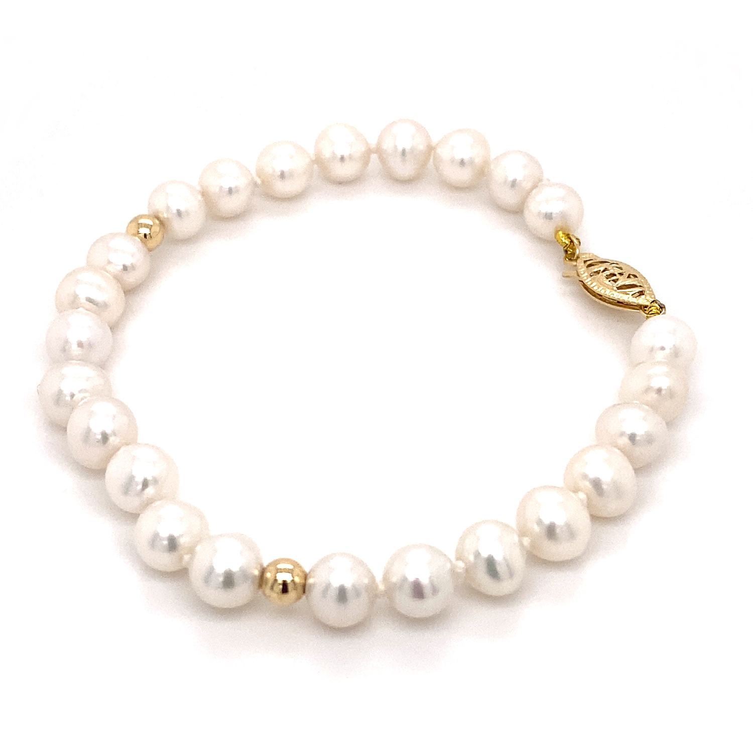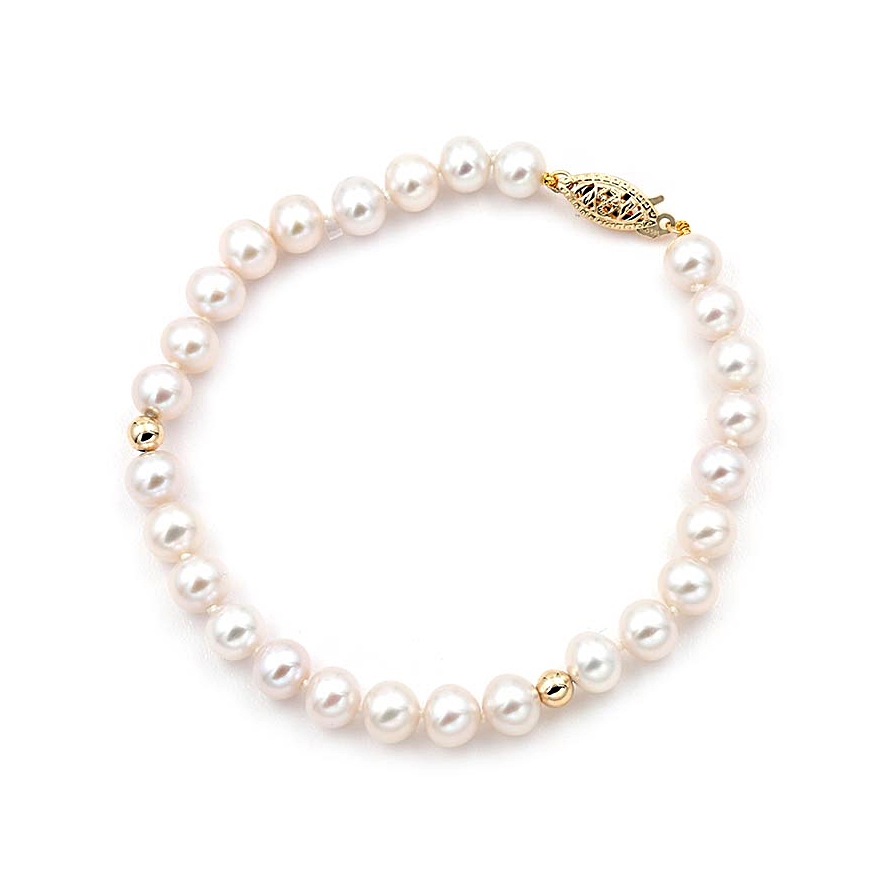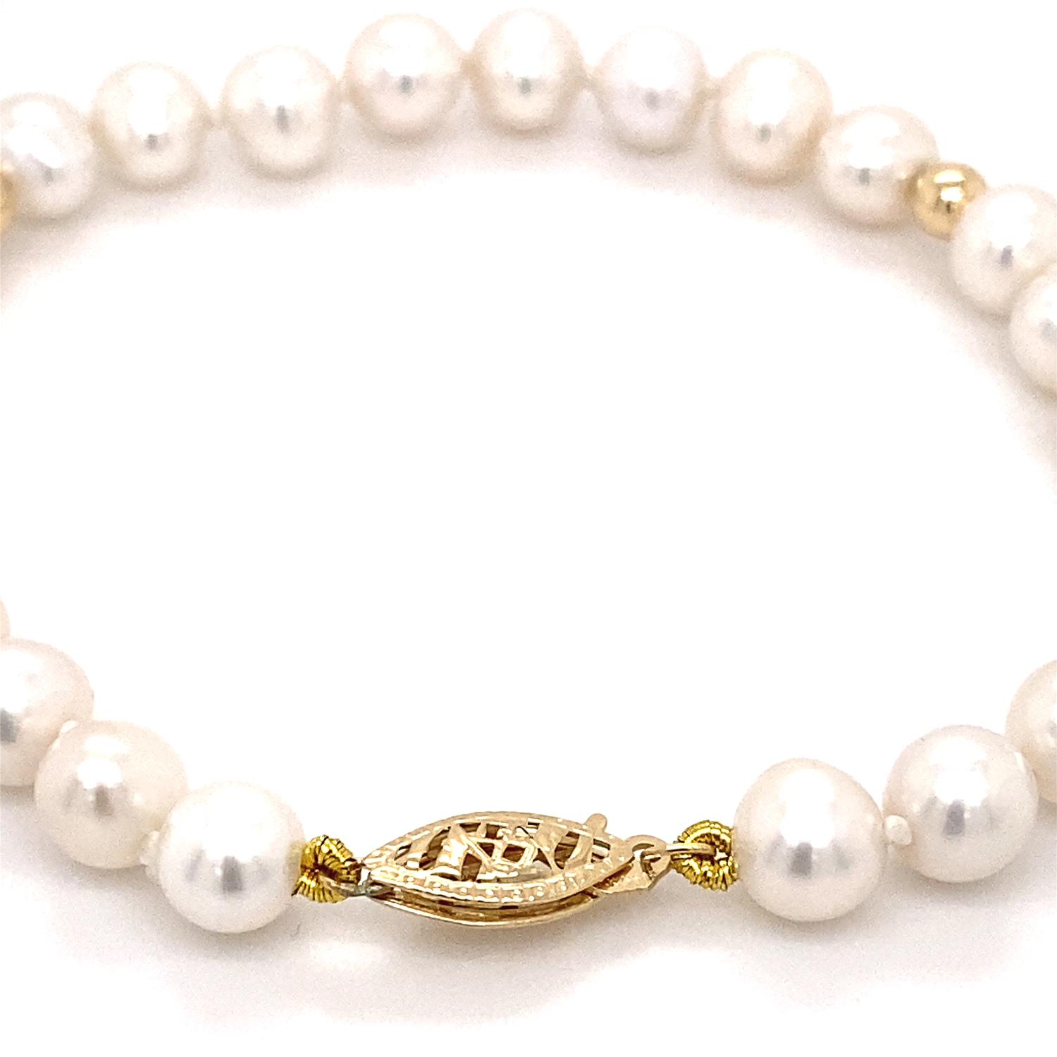 Βραχιόλι με λευκά μαργαριτάρια γλυκού νερού Fresh Water Pearl διαμέτρου 6,0 έως 6,5 χιλιοστών σε σχήμα Round (στρόγγυλο) ποιότητας ΑΑΑ. Ανάμεσα στα μαργαριτάρια υπάρχουν 2 χρυσά στοιχεία 14 καρατίων. Διαθέτει κούμπωμα διπλής ασφαλείας από χρυσό 14 καρατίων. Είναι δεμένο με μεταξωτό νήμα που δημιουργεί κόμπους ενδιάμεσα στα μαργαριτάρια για λόγους προστασίας και ασφάλειας. Το συνολικό του μήκος είναι 18-19 εκατοστά, μπορείτε όμως να το παραγγείλετε σε όποιο μήκος επιθυμείτε.