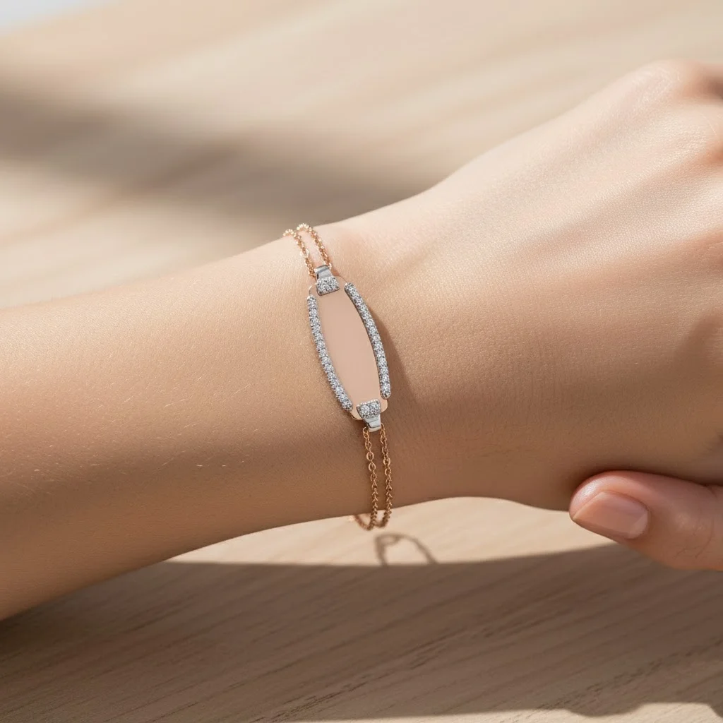 Αναδείξτε το στυλ σας με αυτό το εκλεπτυσμένο βραχιόλι ταυτότητα, έναν συνδυασμό διαχρονικής κομψότητας και μοντέρνας αισθητικής. Σχεδιασμένο για να τραβάει τα βλέμματα, είναι το ιδανικό κόσμημα για κάθε περίσταση. Λόγω της δυνατότητας χάραξης, αποτελεί ένα ιδανικό δώρο για γενέθλια, επετείους, βαπτίσεις ή άλλες σημαντικές στιγμές. Διπλή, λεπτή αλυσίδα ροζ χρυσού για ένα πλουσιότερο και πιο πολυτελές αποτέλεσμα στον καρπό ενώ ο συνδυασμός του ζεστού ροζ χρυσού με τις λαμπερές πέτρες ζιργκόν και το λευκό χρυσό δημιουργεί μια εντυπωσιακή αντίθεση. Φορέστε το μόνο του για μια διακριτική, καθημερινή λάμψη, ή συνδυάστε το με άλλα βραχιόλια (layering) για ένα πιο τολμηρό look.