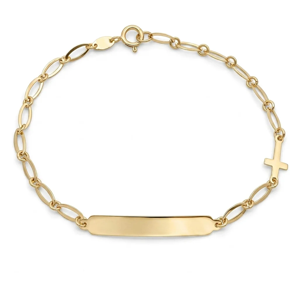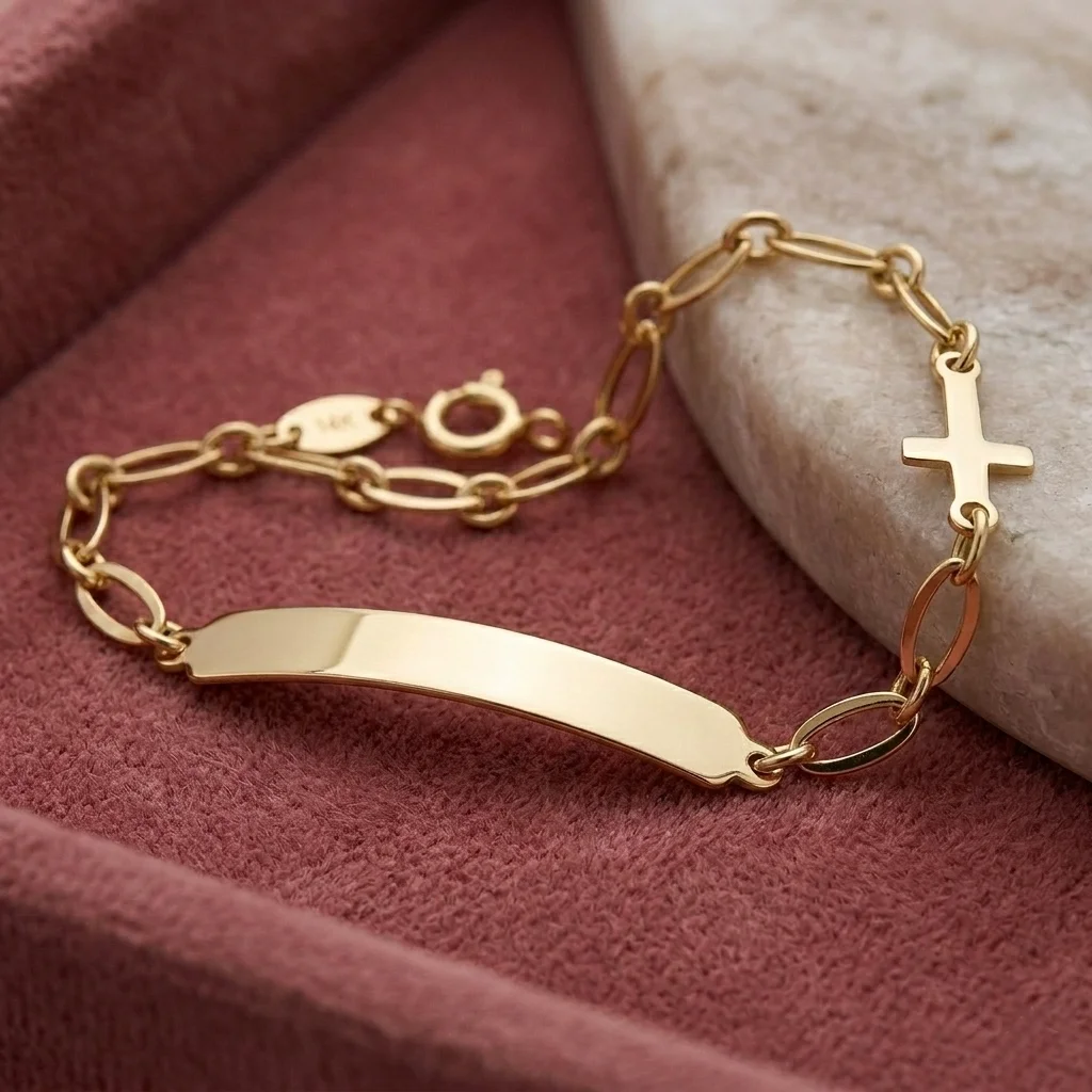 Βραχιόλι Ταυτότητα με Σταυρό σε κίτρινο χρυσό 9 καρατίων. Μήκος αλυσίδας 18cm.