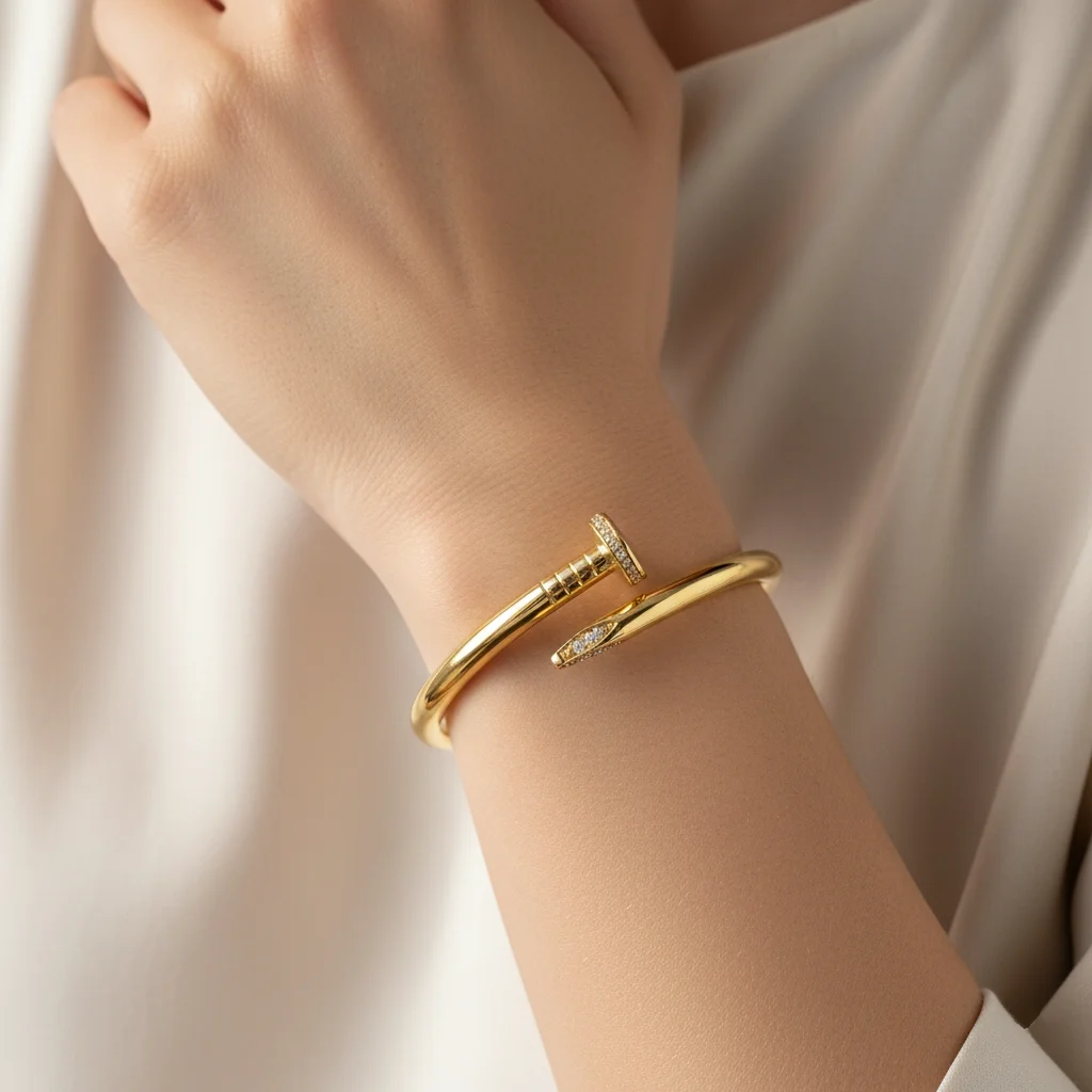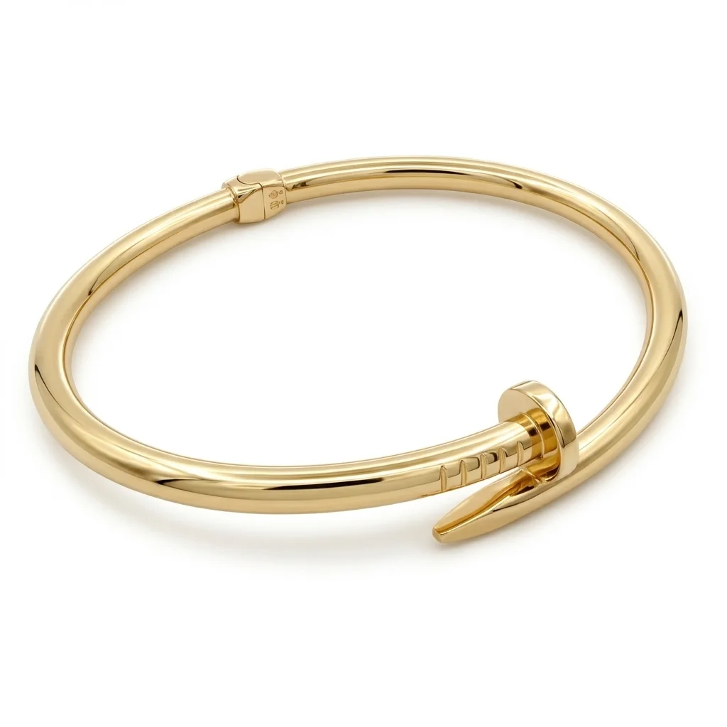 Αυτή η εντυπωσιακή χειροπέδα από χρυσό 14 καρατίων μετατρέπει ένα καθημερινό αντικείμενο σε ένα εμβληματικό κόσμημα. Το σχέδιο “Καρφί” είναι το απόλυτο must-have για όσους θέλουν να ξεχωρίζουν, συνδυάζοντας την industrial αισθητική με την εκλεπτυσμένη κομψότητα του πολύτιμου μετάλλου. Διαθέτει άψογο λουστρέ φινίρισμα και ανατομικό σχεδιασμό που αγκαλιάζει τον καρπό, προσφέροντας άνεση και σιγουριά. Ένα σχέδιο που παραμένει στην κορυφή των τάσεων της μόδας, συμβολίζοντας τη δύναμη και την προσωπικότητα. Το σημαντικό βάρος των 9.30gr προσδίδει την απαραίτητη στιβαρότητα και αίσθηση πολυτέλειας. Ιδανικό για να φορεθεί μόνο του ως το κεντρικό κομμάτι της εμφάνισής σας ή σε συνδυασμό με άλλα χρυσά βραχιόλια για ένα luxury layered look.