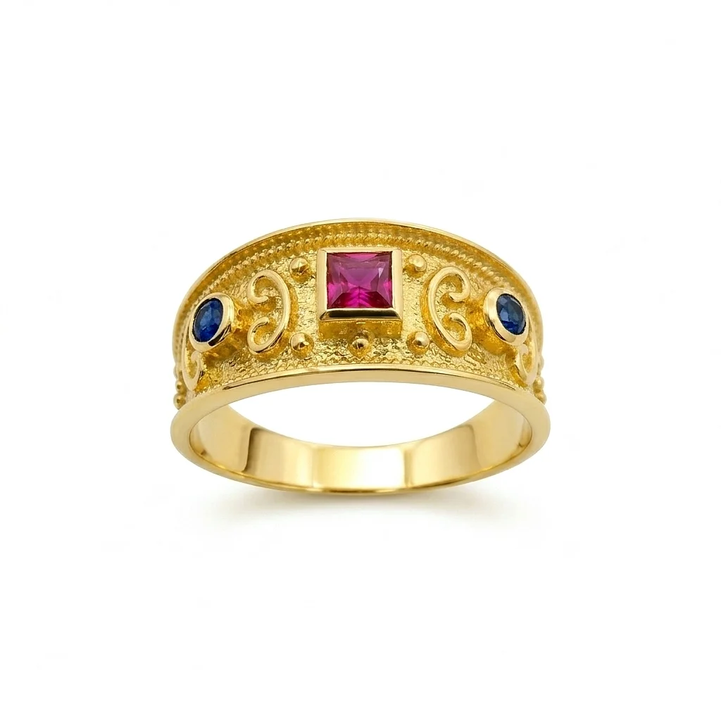 Δακτυλίδι βυζαντινό σε χρυσό 14 καρατίων με κόκκινο και μπλε ζιργκόν.