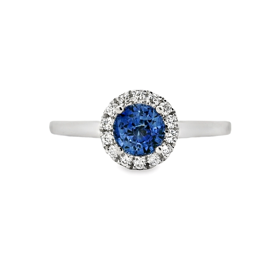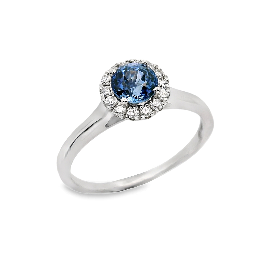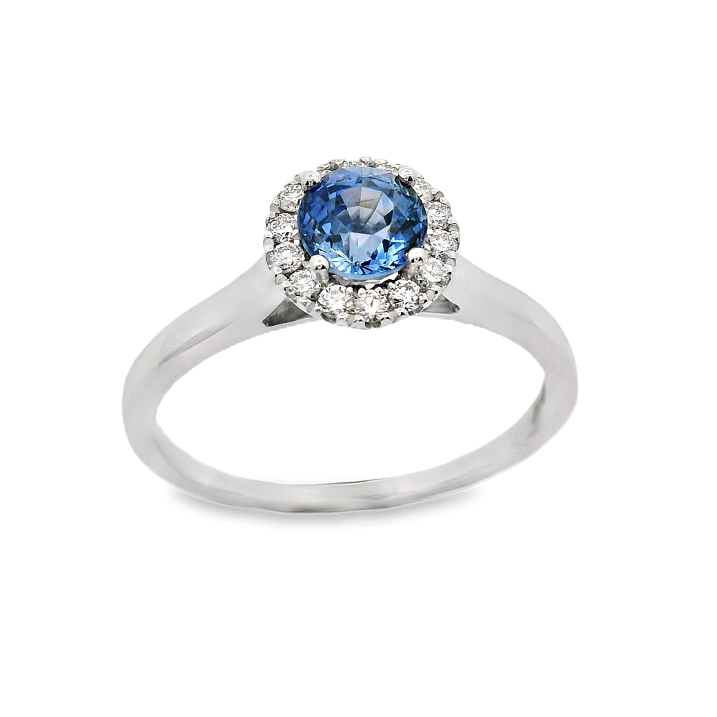 Δακτυλίδι ροζέτα σε λευκό χρυσό 18 καρατίων με Ζαφείρι 0.69ct και λευκά διαμάντια περιμετρικά 0.11ct χρώματος G και καθαρότητας VS.