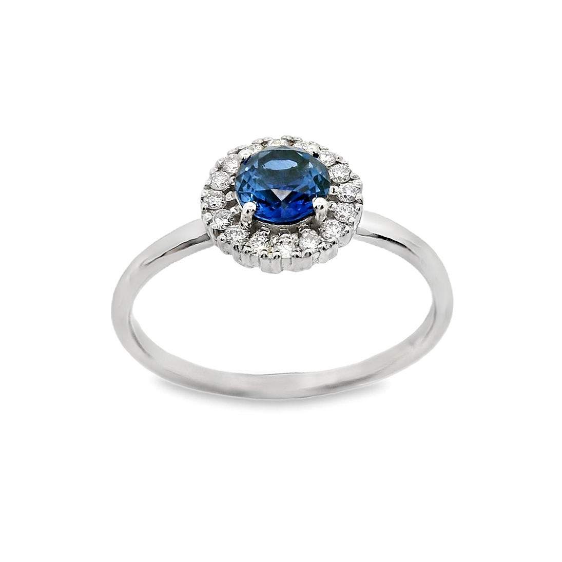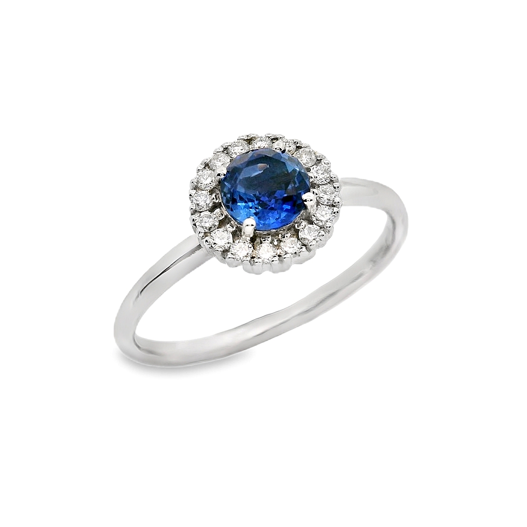 Δακτυλίδι ροζέτα σε λευκό χρυσό 18 καρατίων με Ζαφείρι 0.55ct και λευκά διαμάντια περιμετρικά 0.11ct χρώματος G και καθαρότητας VS.
