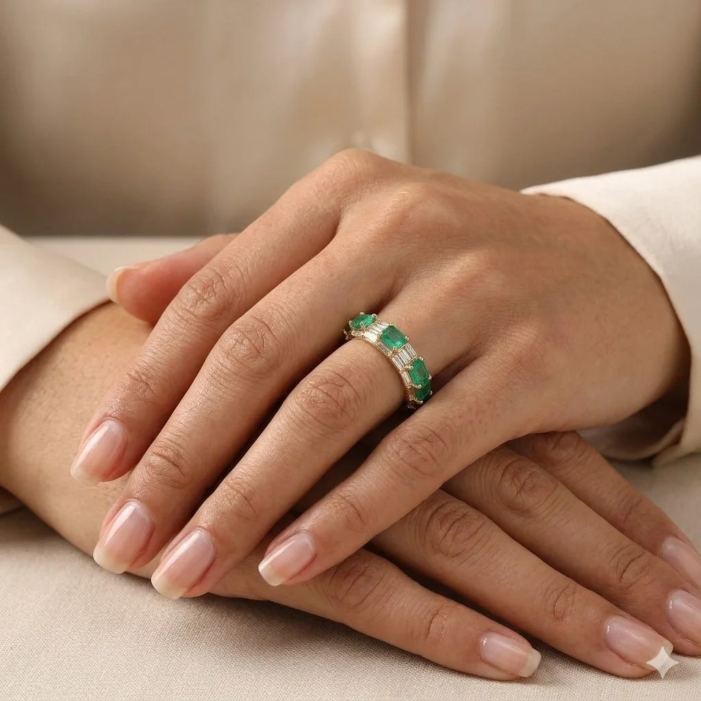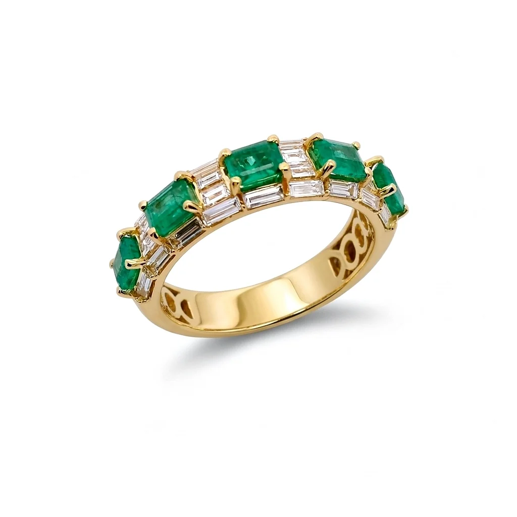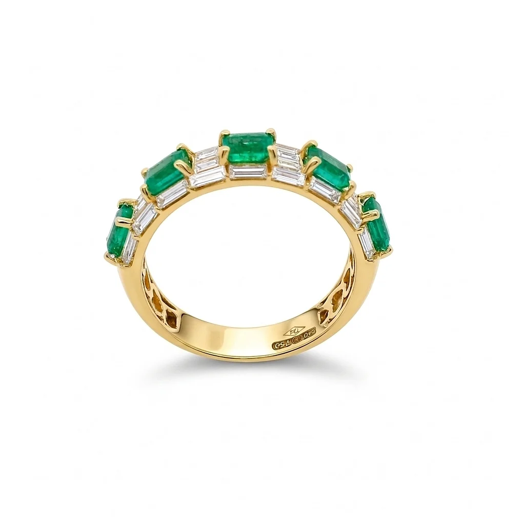 Δακτυλίδι σειρέ σε χρυσό 18 καρατίων με 5 Σμαράγδια συνολικού βάρους 0,96ct και λευκά διαμάντια σε κοπή baguette συνολικού βάρους 0.74ct.