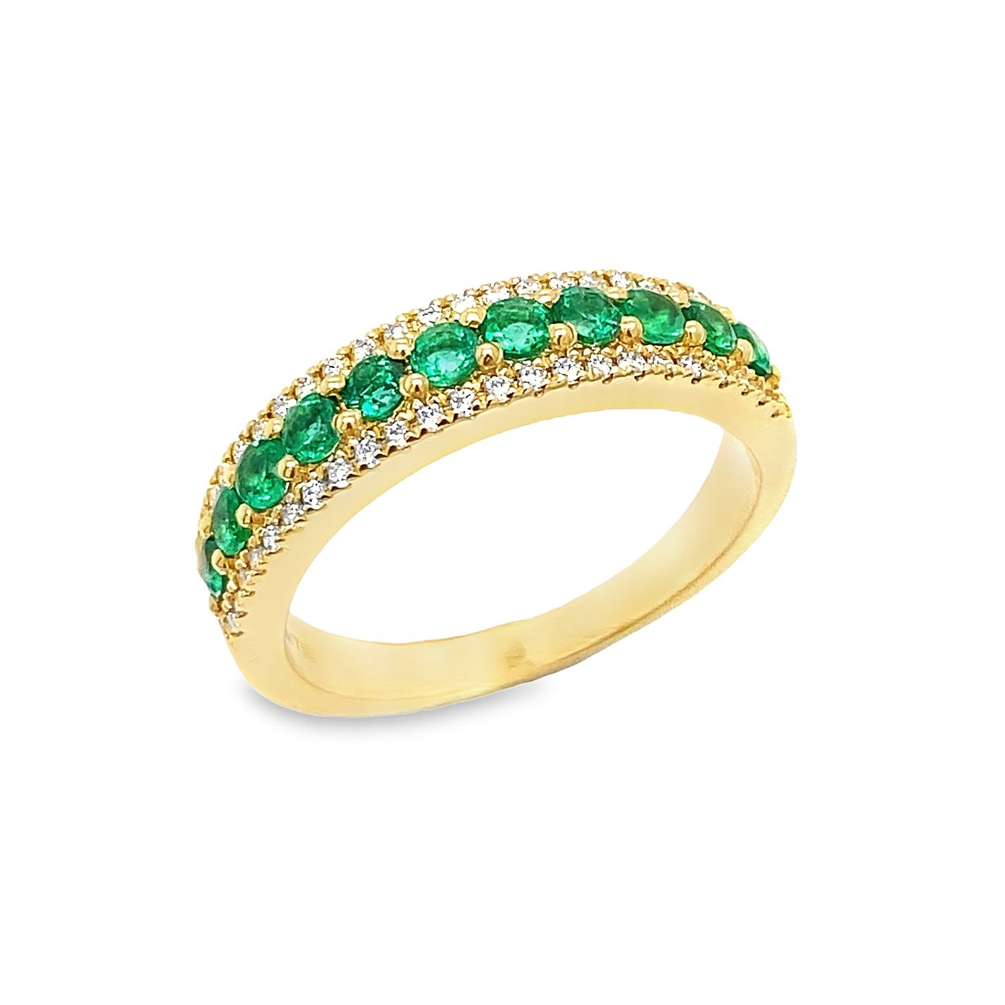 Δακτυλίδι σειρέ σε χρυσό 18 καρατίων με 11 Σμαράγδια συνολικού βάρους 0,49ct και λευκά διαμάντια σε κοπή μπριγιάν περιμετρικά βάρους 0.17ct χρώματος G και καθαρότητας VS.