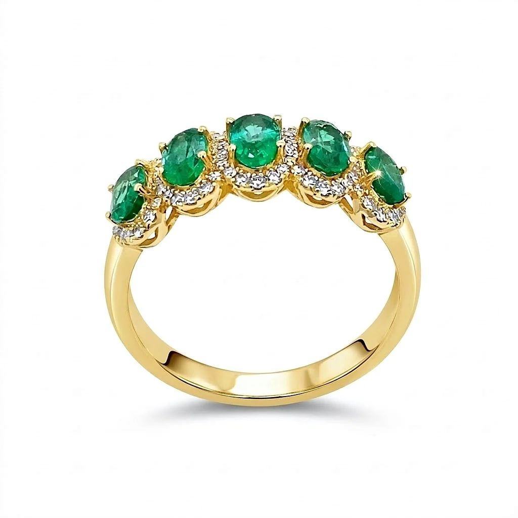 Δακτυλίδι σειρέ σε χρυσό 18 καρατίων με 5 οβάλ σμαράγδια συνολικού βάρους 1.15ct και λευκά διαμάντια σε κοπή μπριγιάν περιμετρικά βάρους 0.26ct χρώματος G και καθαρότητας VS.